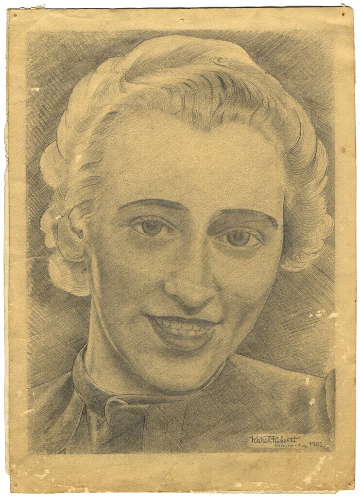 Een potloodtekening gemaakt op dik wit papier met een wit beschermingsblad. De tekening is een portret van Margaretha Roberti-Blekton. Zij is vrijwel en face afgebeeld. Rechtsonder: "Karel Roberti, Utrecht- Aug. 1942".