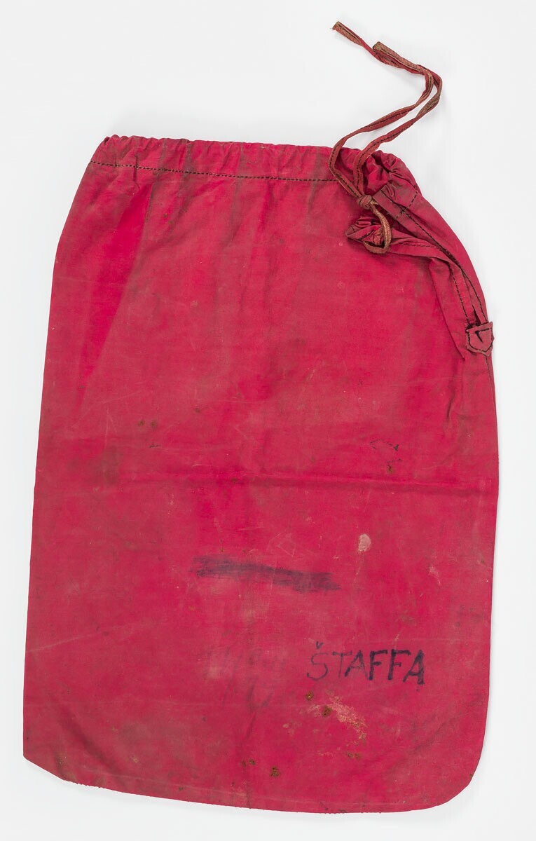 Een rode langwerpige zak gemaakt van zeildoek met koordsluiting. De zak is machinaal gemaakt. Op de zak staat: "11/Bett 19. STAFFA. Hierboven is een naam doorgekrast.