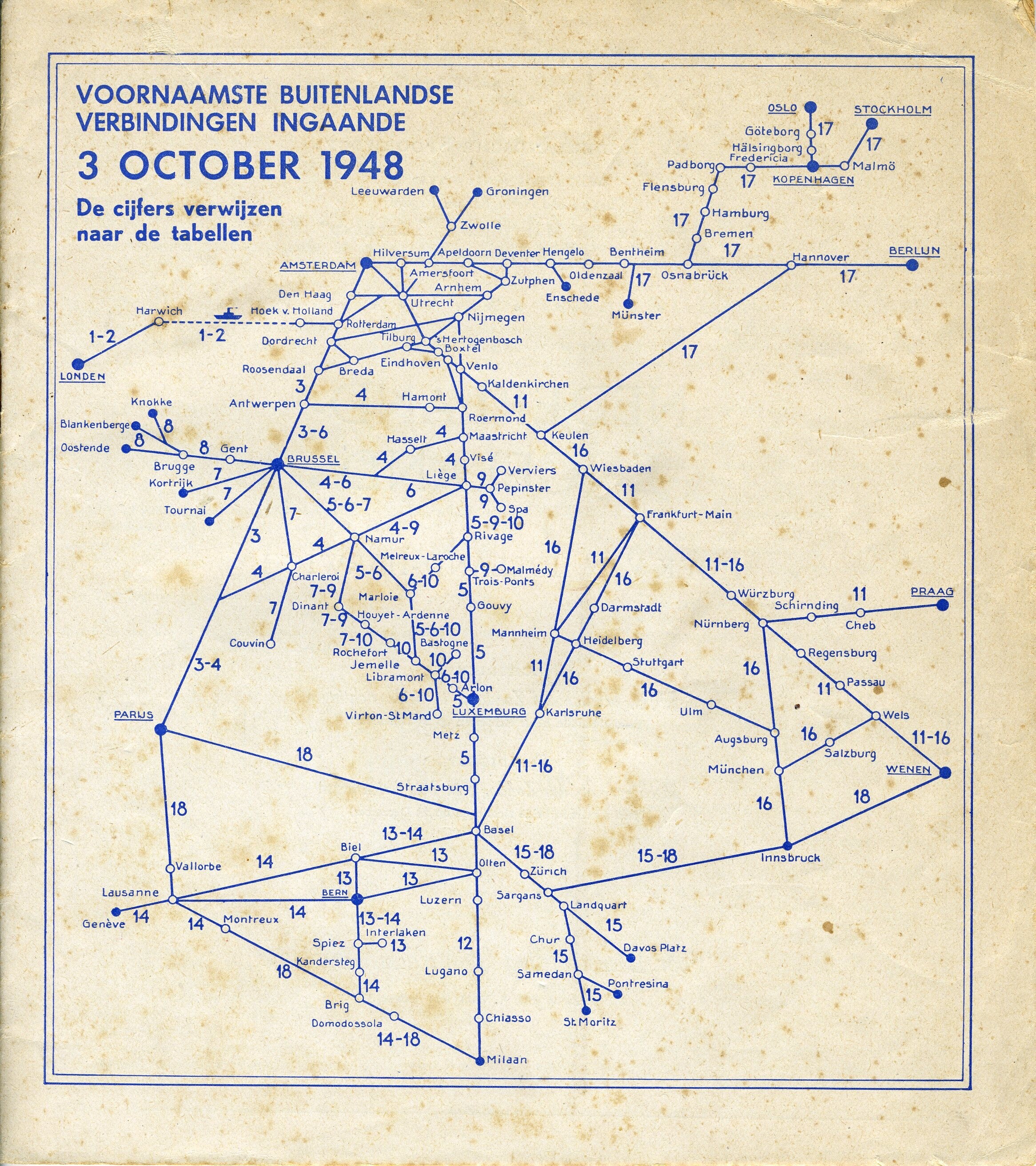 Dienstregeling met de belangrijkste buitenlandse spoorwegverbindingen, ingaande 3 oktober 1948.
