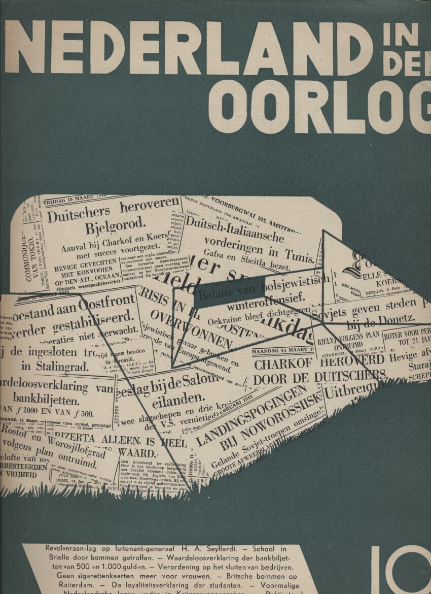 Twee exemplaren van het tiende deel van de uitgave "Nederland in den Oorlog! Historisch document met reproducties van officieele stukken". Het geeft een overzicht van de oorlog aan de hand van artikelen uit de Nederlandse kranten en kopieën van originele documenten van januari tot en met april 1943.
