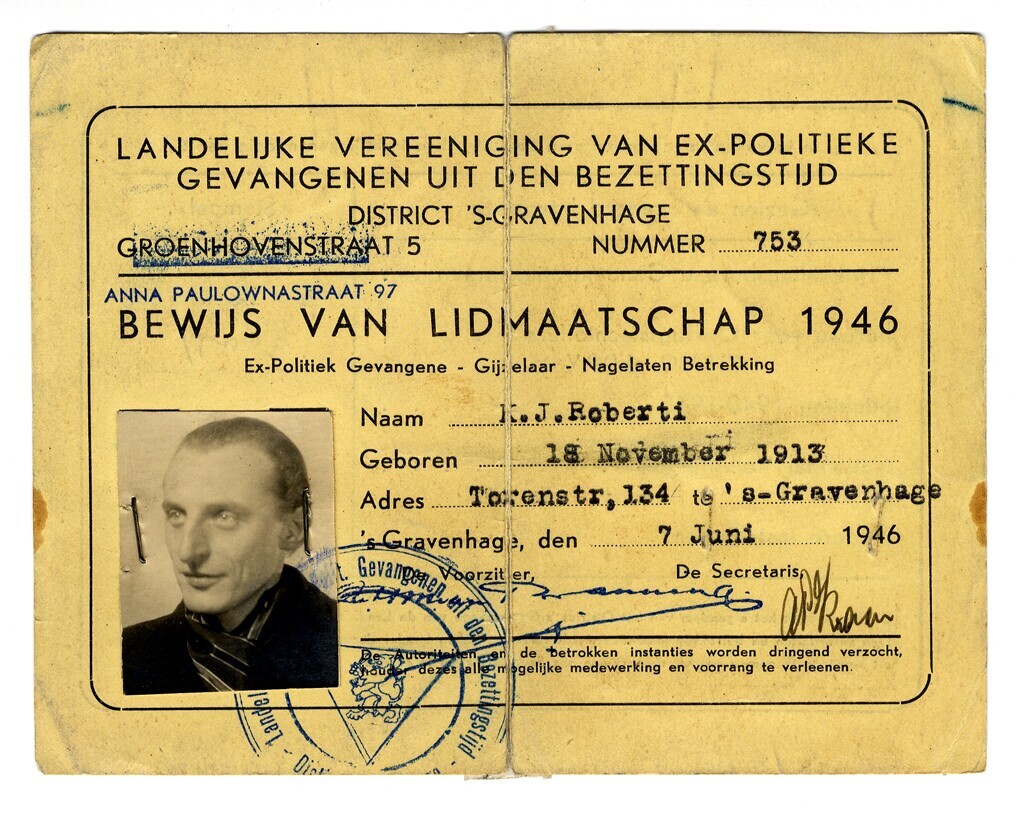 Een lidmaatschapsbewijs uitgegeven te Den Haag op 7 juni 1946 op naam van Karel Johannes Roberti geboren op 18 november 1913 te Den Haag. Het bewijst dat de houder lid is van de 'Landelijke Vereeniging Van Ex-Politieke Gevangenen Uit Den Bezettingstijd. District 's-Gravenhage'.