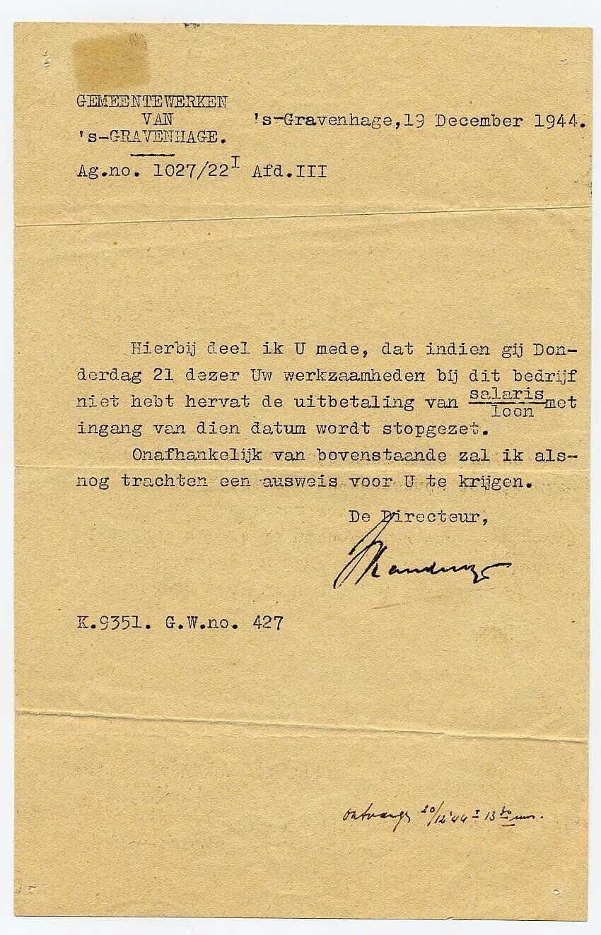 Gestencilde brief met de tekst: "Hierbij deel ik U mede, dat indien gij Donderdag 21 dezer Uw werkzaamheden bij dit bedrijf niet hebt hervat de uitbetaling van salaris/loon met ingang van dien datum wordt stopgezet. Onafhankelijk van bovenstaande zal ik alsnog trachten een auweis voor U te krijgen."