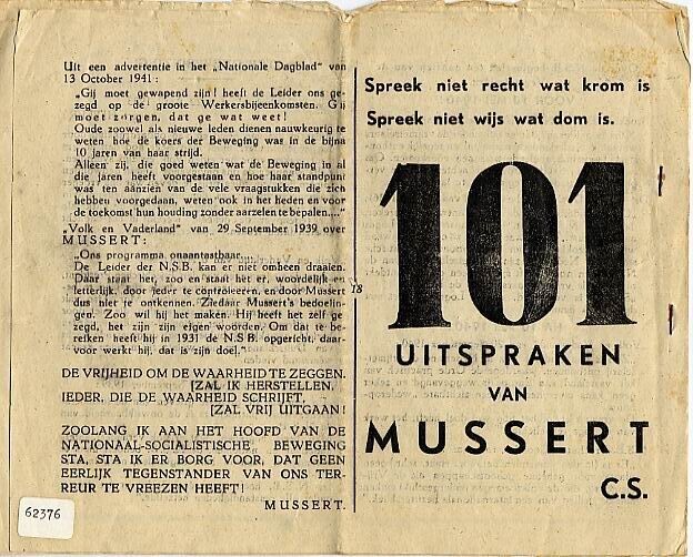 Illegaal uitgegeven bloemlezing van uitspraken van Anton Mussert en andere N.S.B.'ers, met betrekking tot joden, het Oranjehuis, rassenleer en christendom. Elke pagina is in tweeën verdeeld, met links uitspraken van vóór 10 mei en rechts uitspraken van na 10 mei 1940.