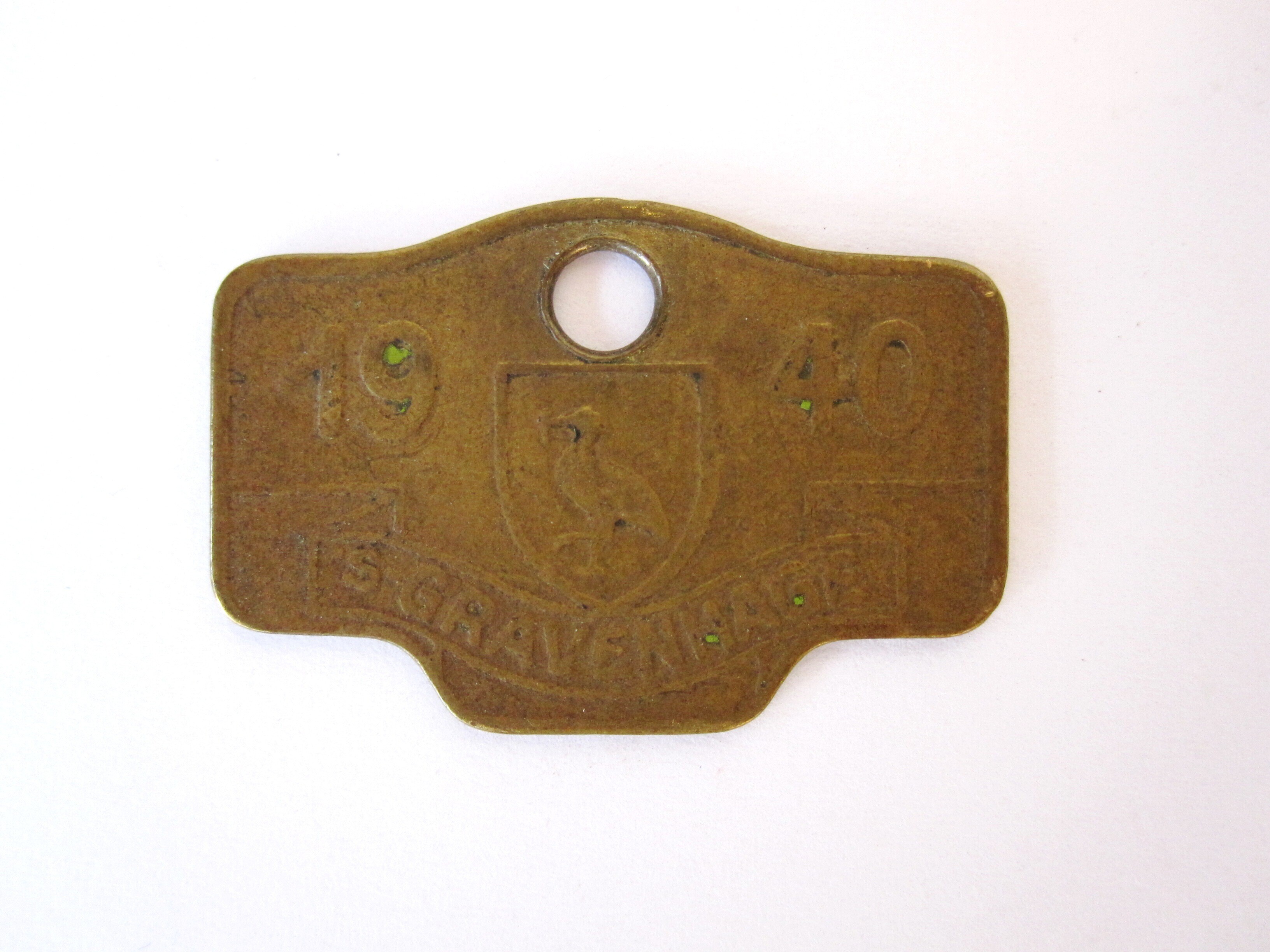 Een koperen fietsplaatje met het wapen van Den Haag en het opschrift: "1940 's Gravenhage". Op de achterkant is het nummer 1/839 gegraveerd.