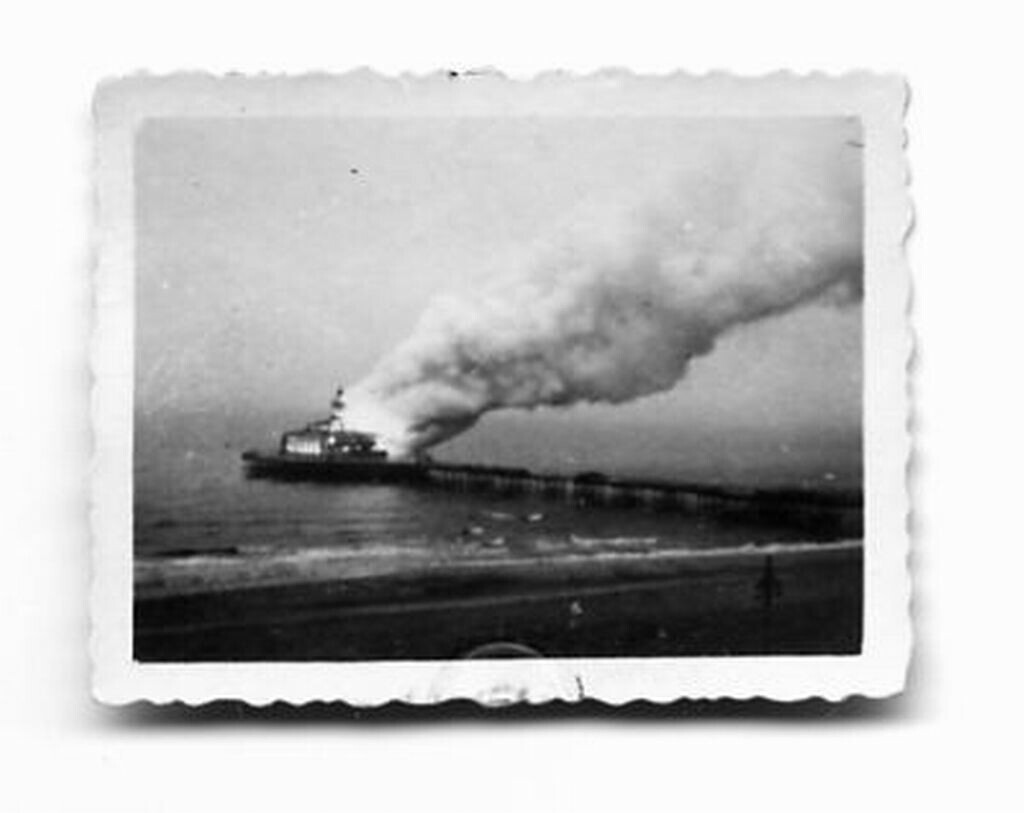 Een zwart-wit foto met de afbeelding van het brandende paviljoen op de Scheveningse. De pier zelf is nog intact.