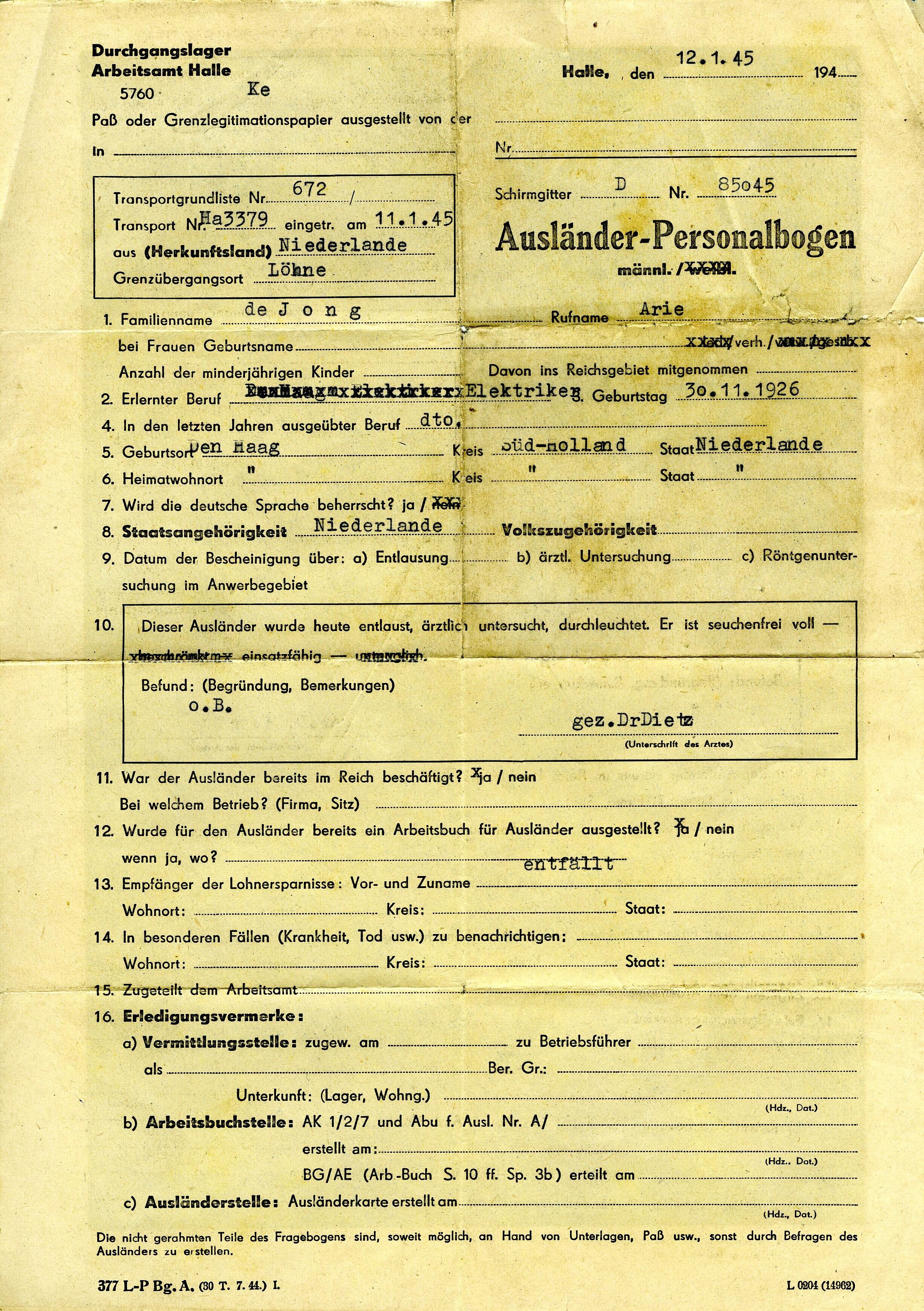 Een registratieformulier "Ausländer-Personalbogen" van het "Durchgangslager Arbeisamt Halle" met de personalia van de "Elektriker" Arie de Jong geboren op 30 november 1926 te Den Haag. Op het formulier staat een verklaring van de arts Dr. Dietz, dat "Dieser Ausländer wurde entlaust, ärtztlich untersucht, durchleuchtet. Er ist seuchenfrei voll einsätsfähig". Het formulier is gedateerd: 12 januari 1945.