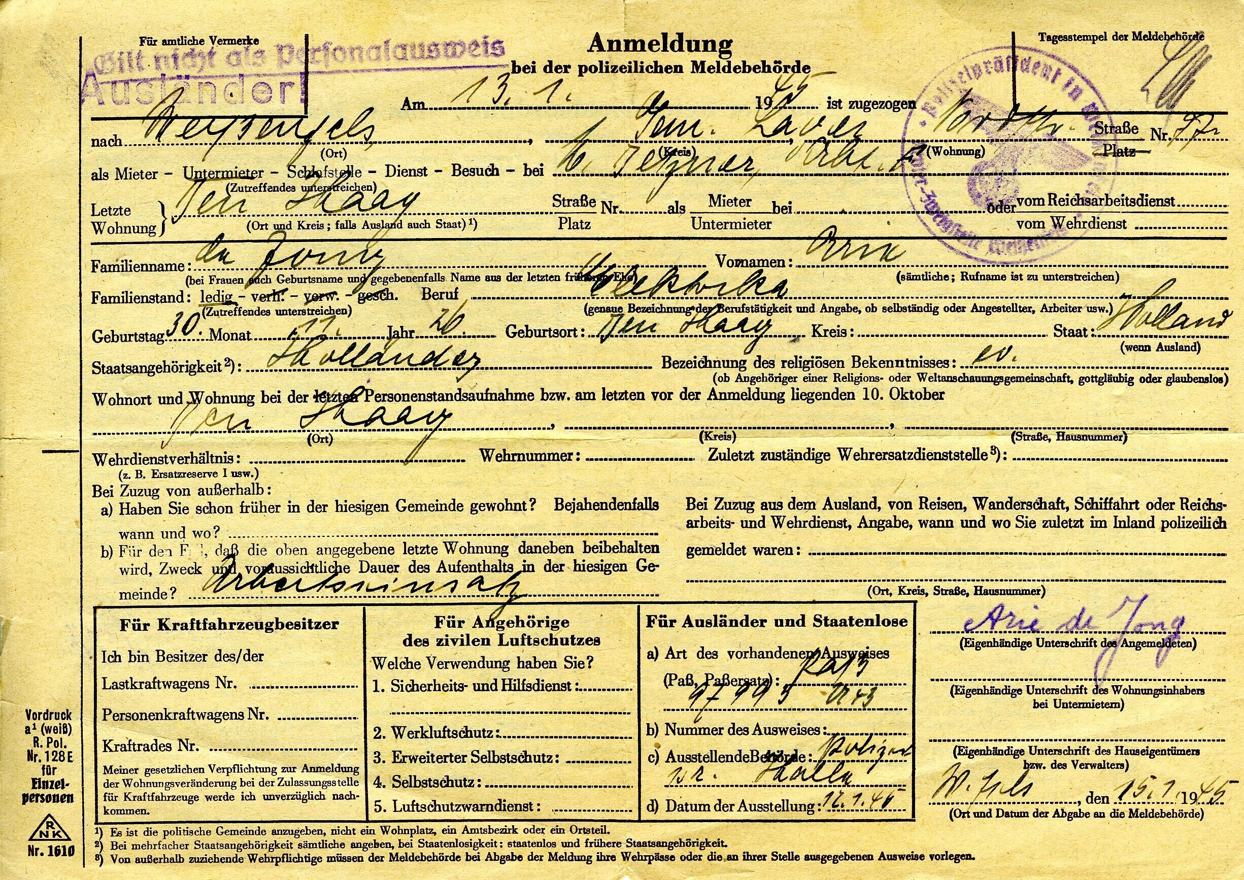 Een registratieformulier: "Anmeldung bei der polizeilichen Medebehörde" opgesteld op 13 januari 1945 en ondertekend op 15 januari 1945 te Weissenfels dat de "Elektriker" Arie de Jong geboren op 30 november 1926 te Den Haag als onderhuurder is ingetrokken in "Weissenfels. Gem. Lager nr. 77". Bovenaan een stempel met in gotische letters met: "Gilt nicht als Personalausweis" en een stempel in gewoon lettertype: "Ausländer".