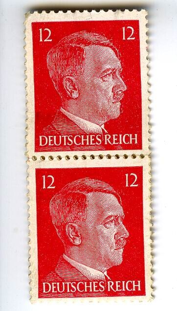 Een postzegel met rode opdruk. Afgebeeld is een portret van Hitler van rechts gezien. Tekst: "Deutsches Reich 12". Het gaat om vier stuks die twee aan twee aan elkaar zijn geplakt.