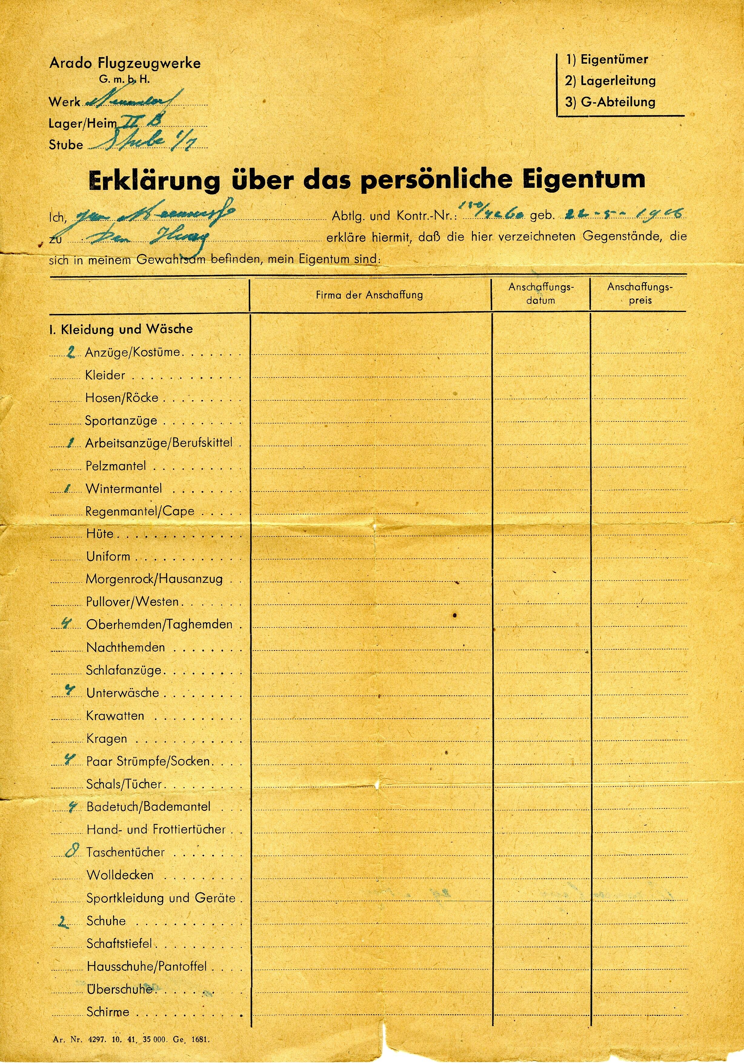 Een "Erklärung über das persönliche Eigentum" opgesteld te Brandenburg op 29 augustus 194? op naam van "Jan Meeuwisse" geboren te Den Haag. De verklaring van de "Ardo Flugzeugwerke G.m.b.H." bevat een lijst met kledingstukken en gebruiksvoorwerpen die aan hem zijn overhandigd.