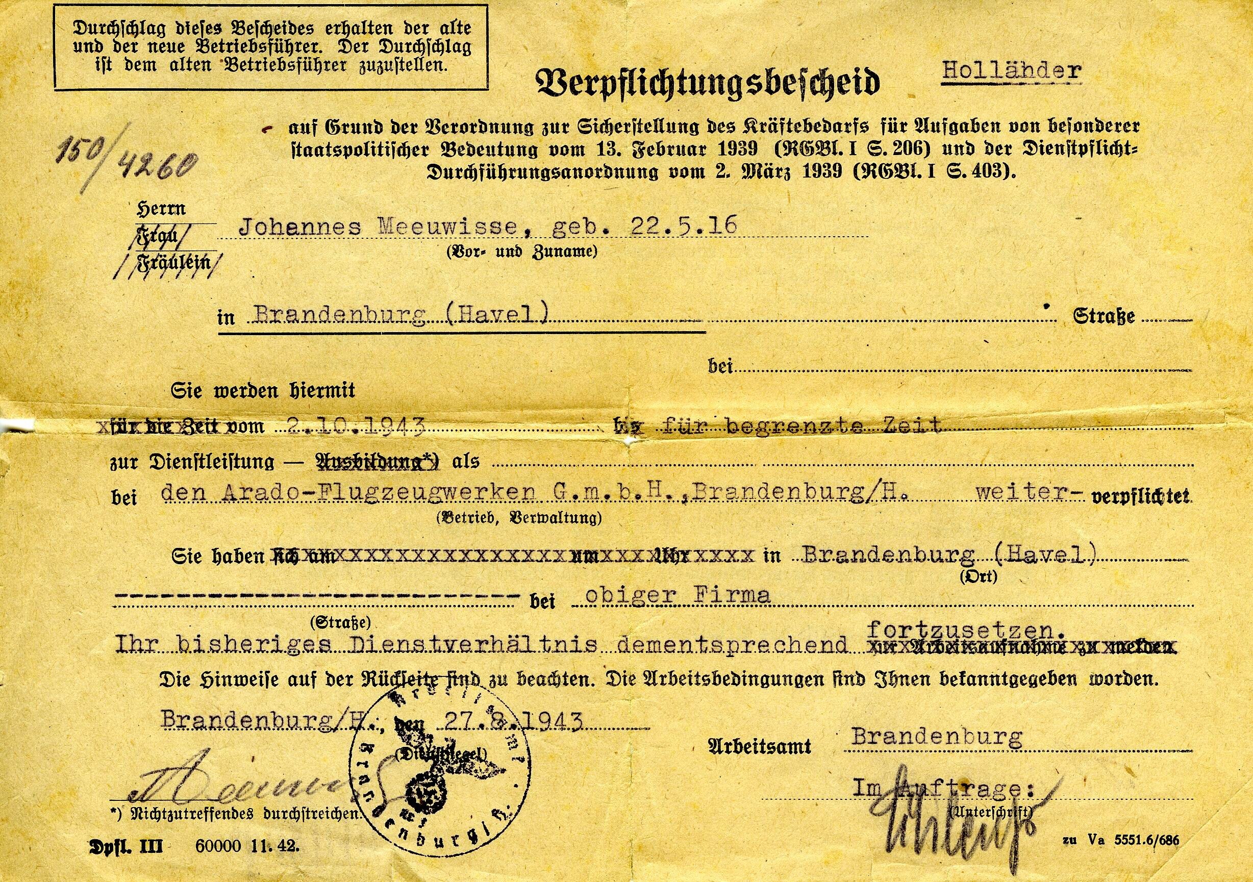 Een "Verpflichtungsbescheid" waarin Johannes Meeuwissen, geboren op 22 mei 1916 voor beperkte tijd wordt verplicht om bij de "Arado-flugzeugwerken G.m.b.H." te Brandenburg/H. in zijn huidige dienstbetrekking verder te werken. De tewerkstelling is gedateerd 27 augustus 1943.