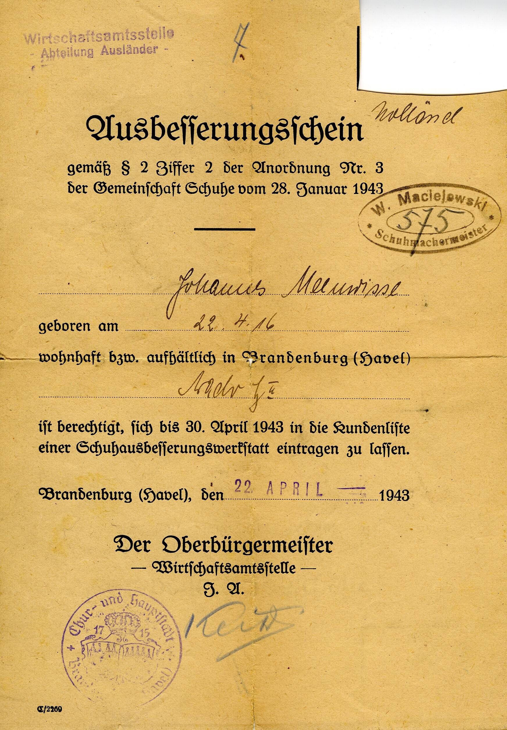 Een "Ausbesserungsschein" waarin Johannes Meeuwissen, geboren op 22 april (?) 1916 gerechtigd is zich tot 30 april 1943 in te laten schrijven op een klantenlijst van een schoenmaker. Deze vergunning is uitgegeven te Brandenburg/H. op 22 april 1943.