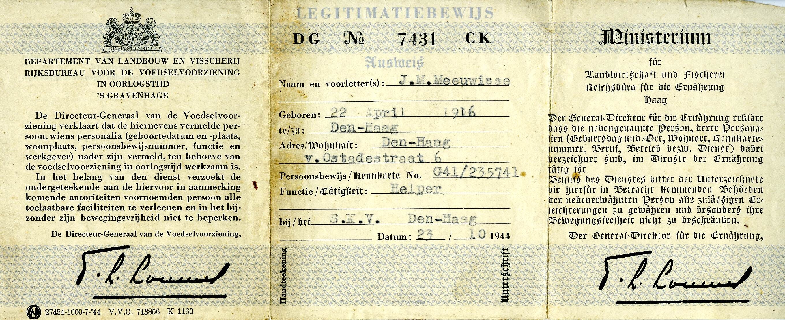 Een gedrukt legitimatiebewijs in het Nedderlands en in het Duits van het "Departement van Landbouw en Visscherij Rijksbureau voor de voedselvoorziening in oorlogstijd 's-Gravenhage" op naam van J.M. Meeuwisse, geboren op 22 april 1916 te Den Haag, woonachtig aan de Van Ostadestraat 6 te Den Haag met de functie van "Helper bij S.K.V. Den Haag".<br>