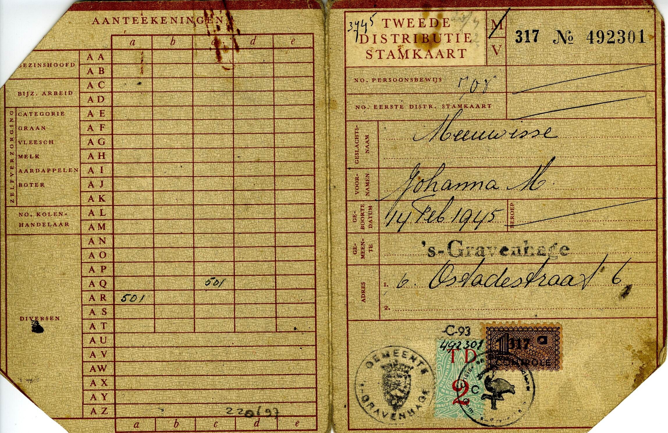 Een "Tweede Distributie Stamkaart" uitgegeven te den Haag op naam van Johanna M. Meeuwisse geboren op 14 februari 1945. In het bewijs zijn o.a. de uitgereikte bonnen en bonkaarten genoteerd.
