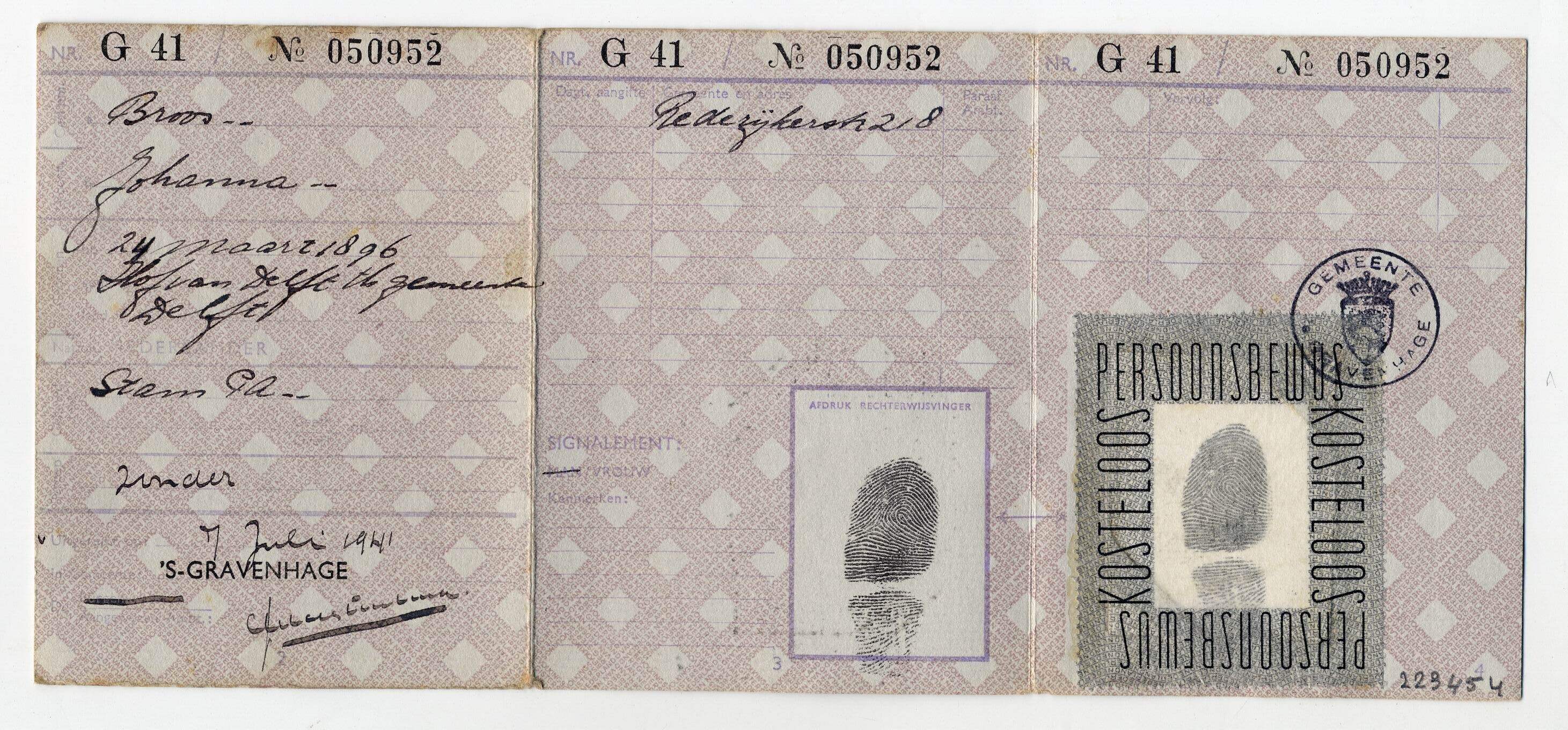 Een persoonsbewijs gesteld op naam van: "Broos, Johanna, Rederijkerstraat 218, 24 Maart 1896, Hof van Delft v/d(?) gemeente Delft" en afgegeven 7 Juli 1941 te Den Haag. Op het persoonsbewijs zijn twee duimafdrukken geplaatst en een zwart-wit pasfoto van de houdster bevestigd.