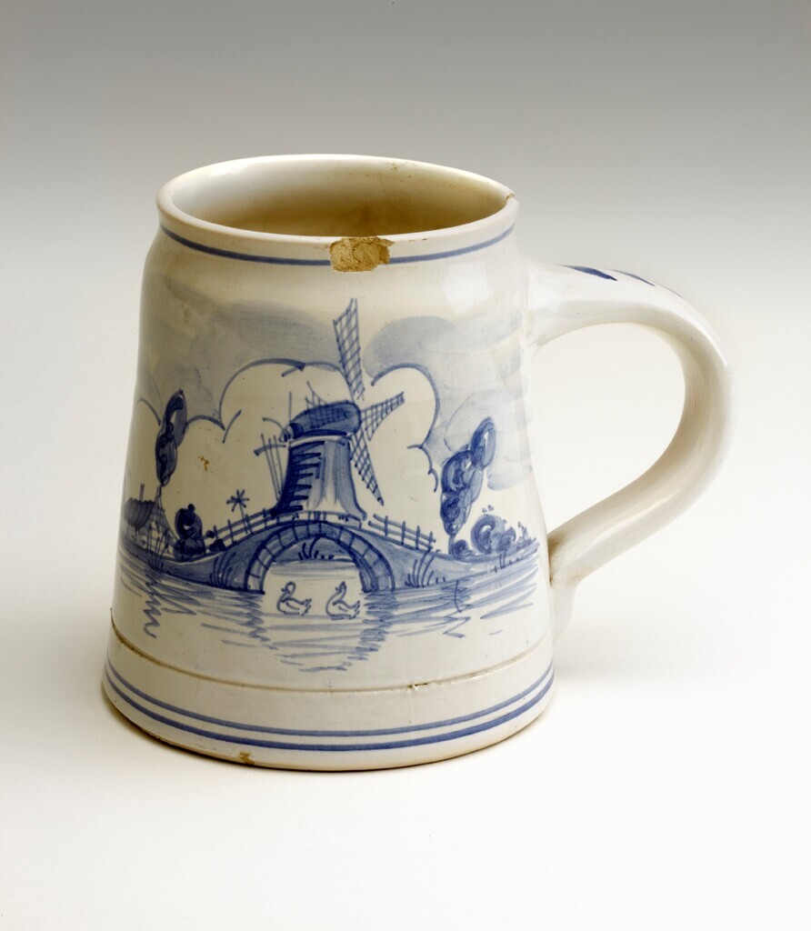 Een Delftsblauwe, aardenwerken bierpul met de afbeelding van een Hollands landschap met molen en een bruggetje. Aan de onderzijde: "Kriegsweihnachten 1943" en: "Gouda" en "Holland".