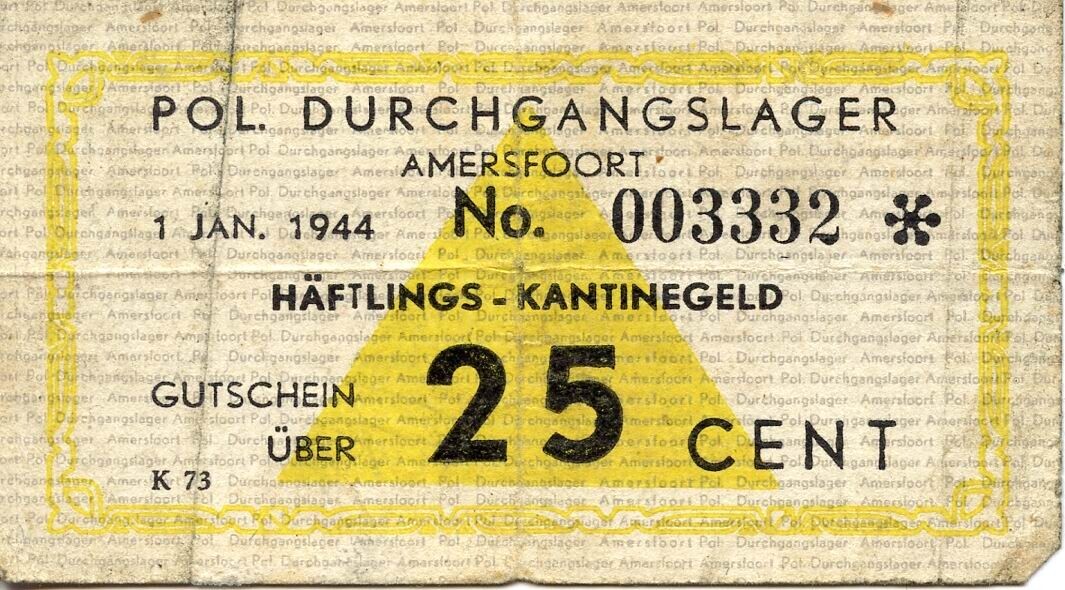 Een bon met zwarte en gele opdruk. Op te bon staat: "Pol. Durchgangslager Amersfoort 1 Jan 1944 No. 003332 Häftlings-kantinegeld. Gutschein über 25 cent. Op de achterkant in het Duits onder welke voorwaarden en voor wie deze bon te besteden is.