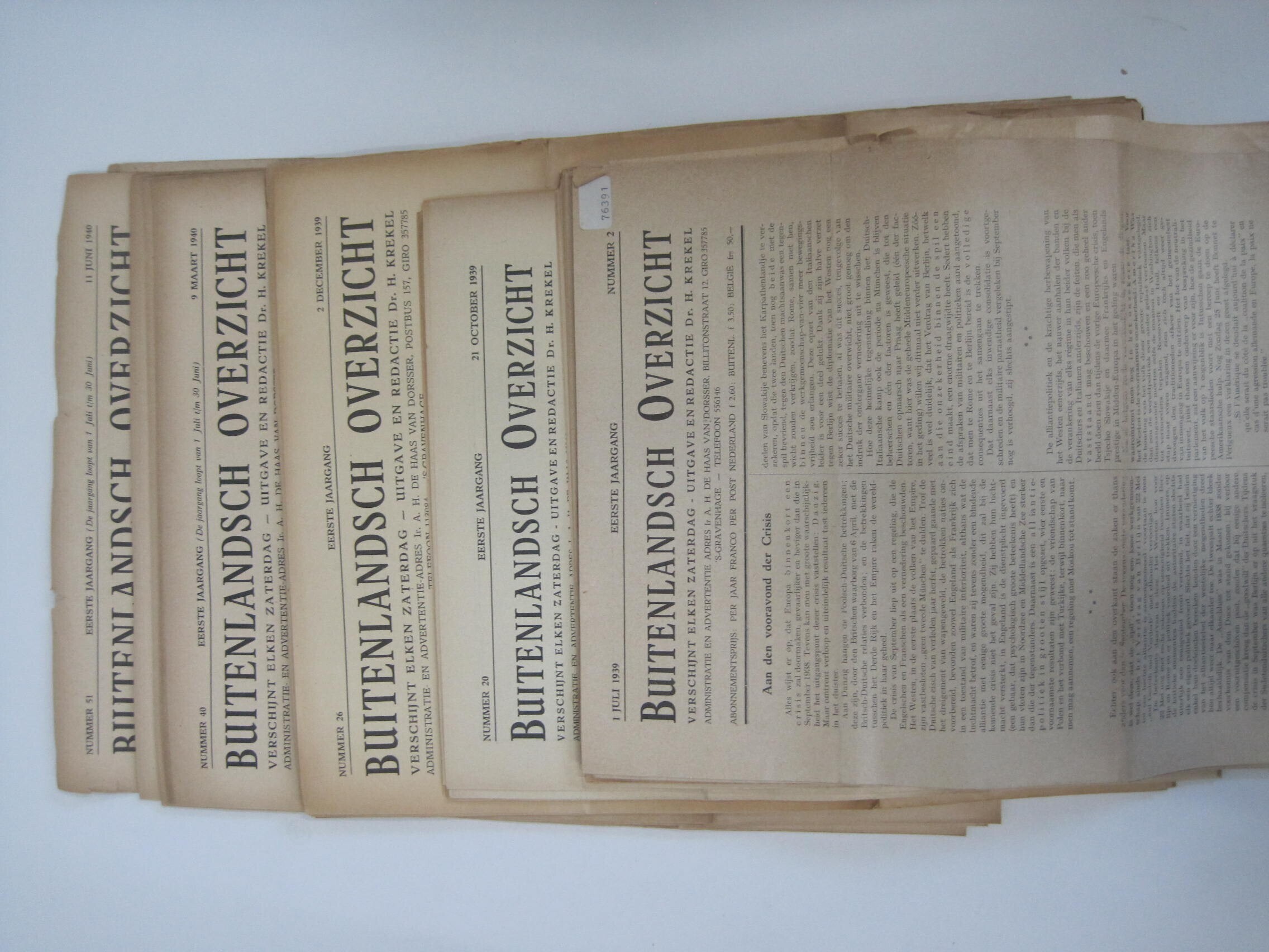De eerste jaargang van het weekblad "Buitenlandsch Overzicht" onder de redactie van de NSB-er H. Krekel. Deze jaargang loopt van 1 juli 1939 tot en met 24 juli 1940 (de nummers 2-53). Inclusief een bijlage.