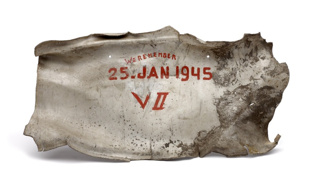Een stuk van de romp van de V2 die vanuit het Scheveningse bos werd gelanceerd richting Londen. Deze afzwaaier kwam echter terecht in de Riouwstraat te Den Haag en verwoeste een rij huizen. Hierbij vielen 10 doden. Tot de zwaar gewonden behoorde mevrouw Toos Schouten die het overleefde, maar wel verminkt door veel littekens en aan één oog blind verder moest. Haar man, Louis, werd licht gewond en zoontje Robby (geboren 21 december 1938) mankeerde als door een wonder niets. Nadat hij uit het ziekenhuis was ontslagen doorzocht Louis de ruïne van zijn huis, Riouwstraat nummer 126, op nog waardevolle spullen, maar het meeste was al gestolen. De Perzische tapijten zag hij later in een winkel op het Noordeinde liggen. In de ruïne vond hij wel het stuk van de V2 dat hij, ondanks de risico's, meenam als macaber souvenir. Hij hing het op in een gang van de latere woning, maar zijn vrouw kon de herinnering niet verdragen en zo verdween het naar zolder. Op het stuk van de V2 heeft Louis Schouten met rode verf geschilderd: "We remember 25. jan 1945 V II". Toegevoegd zijn 2 zwart-wit foto's van de resultaten van inslag. Op één daarvan is het bed te zien, waarin het zoontje van zes sliep.