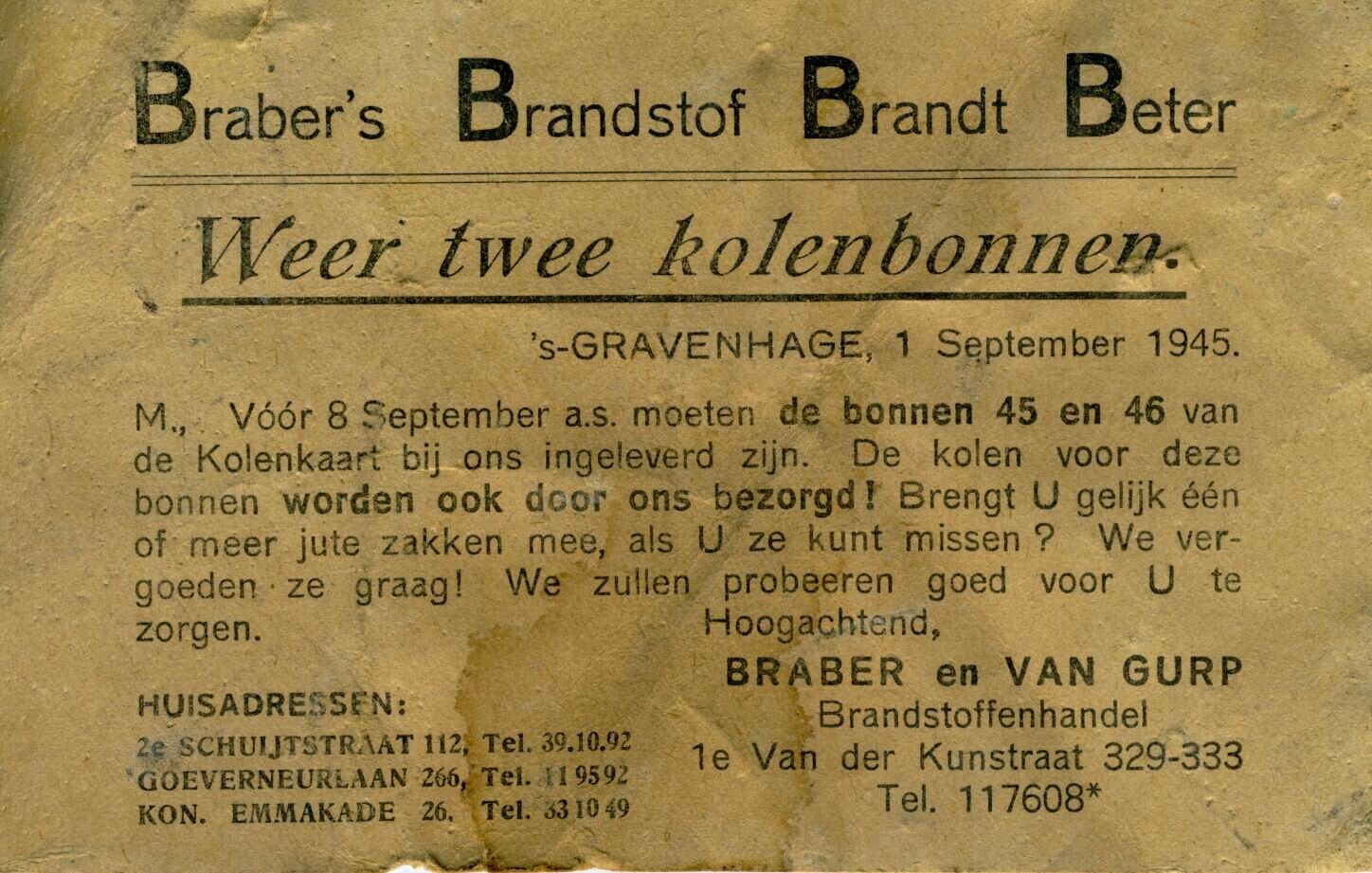 Een gedrukt bericht met als kop: "Braber's Brandstof Brandt Beter" uit naam van Braber en Van Gurp Brandstoffenhandel verstuurd met dagtekening: 's-Gravenhage, 1 september 1945. In het bericht wordt erop gewezen, dat de bonnen 45 en 46 van de Kolenkaart vóór 8 september a.s. bij Braber en van Gurp moeten worden ingeleverd met het verzoek om één of meer jute zakken mee te brengen. De kolen worden dan door Braber en Van Gurp thuis bezorgd.