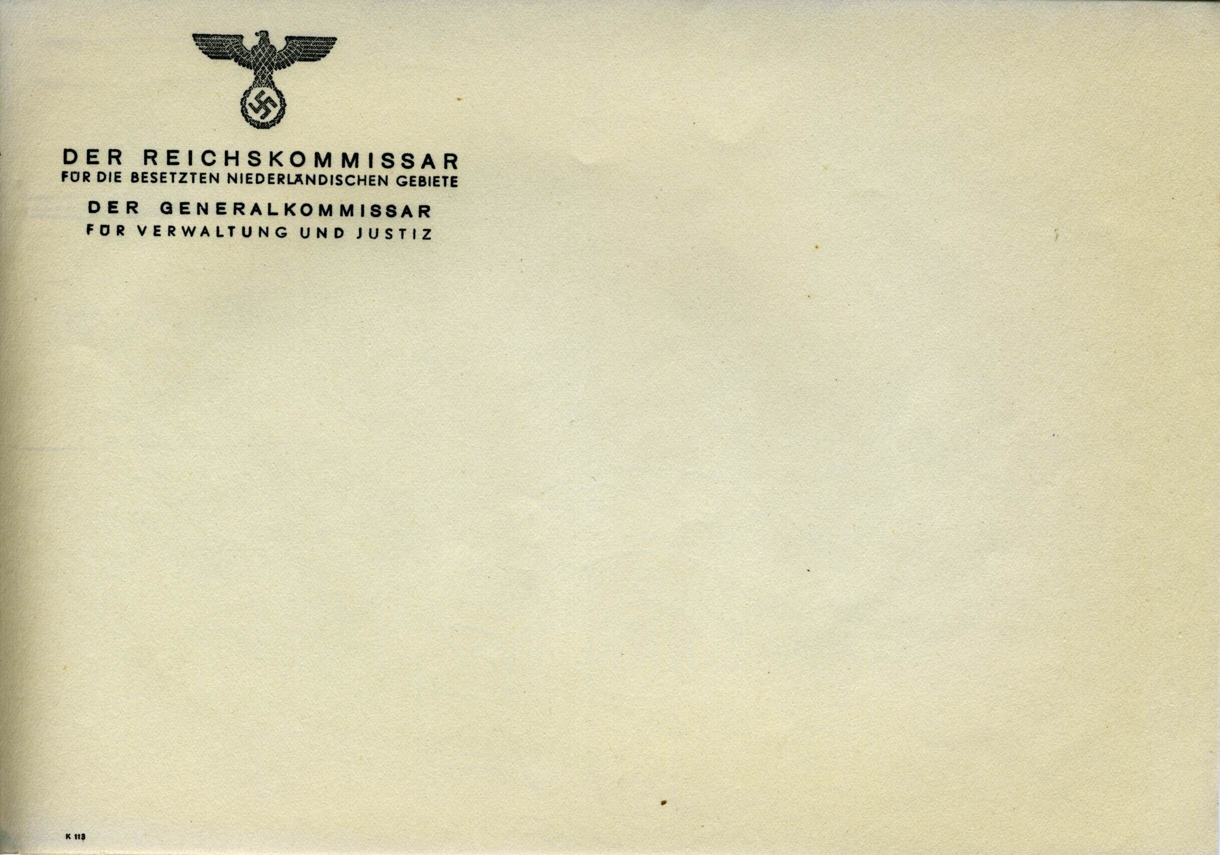 Zeven vellen leeg briefpapier met als voorgedrukt briefhoofd: "Der Reichskommissar für die Besetzten Niederländische Gebiete. Der Generalkommissar für Verwaltung und Justiz" met daarboven de Duitse rijksadelaar met in de klauwen een lauwerkrans met daarin een hakenkruis. Het papier heeft een Nederlands watermerk: Amstel-Bank | G.H.B. binnen twee cirkels. Een ongebruikte lege envelop met op de achterkant: "Der Reichskommissar für die Besetzten Niederländische Gebiete". Zes ongebruikte enveloppen met een voorgedrukte rode postzegel: "Nederland 7 1/2 cent".