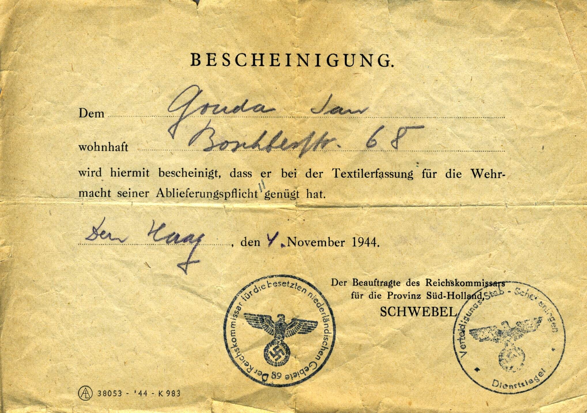 Een vervalste verklaring op naam van Jan Gouda waarmee "bescheinigt, dass er bei der textielerfassung für die Wehrmacht seiner Ablieferungspflicht genügt hat" met datum Den Haag 1 november 1944. Met een stempel van de Rijkscommissaris en een van de "Verteidigungs-Stab - Scheveningen".