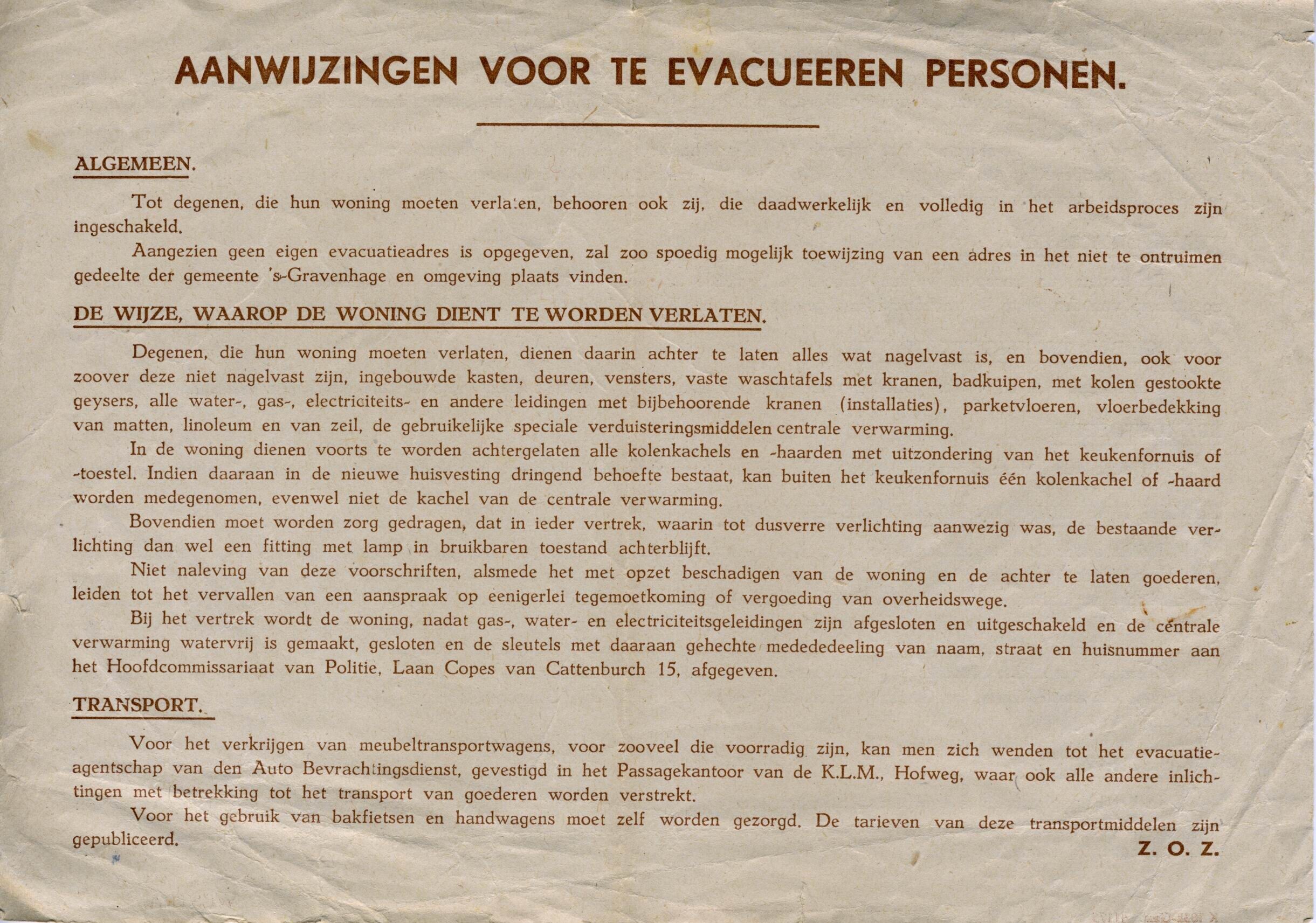 Een gedrukt pamflet met als titel: "Aanwijzingen voor te evacueeren personen" uit naam van "De Burgemeester Westra".