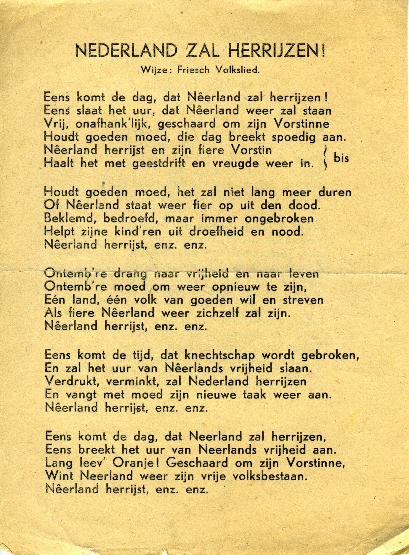 Een gedrukt pamflet met daarop aan een kant het lied "Nederland zal herrijzen! Wijze: Friesch Volksl...