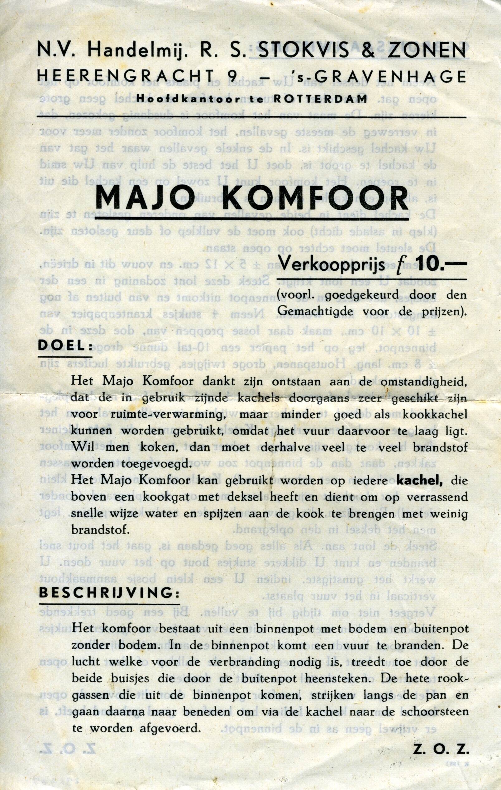 Een op één blad papier gedrukte beschrijving en gebruiksaanwijzing voor een "Majo Komfoor" van de "N.V. Handelmij. R.S. Stokvis & Zonen Heerengracht 9 - 's-Gravenhage. Hoofdkantoor Rotterdam".
