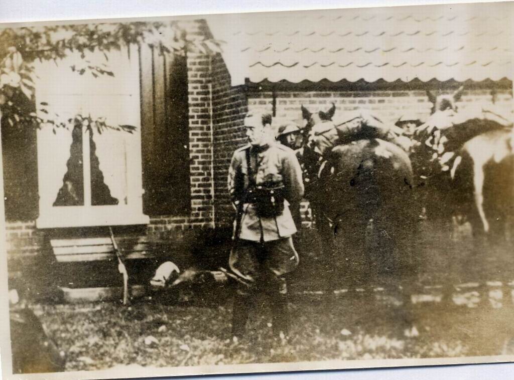 Foto van prins Bernard in uniform voor een huis met achter hem twee militairen naast hun paard.