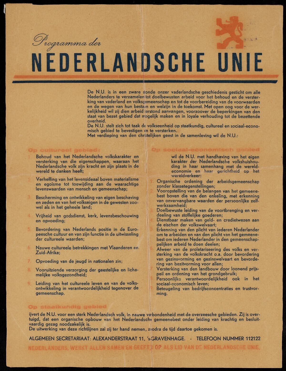 Programma van de Nederlandsche Unie uitgevoerd in blauwe en oranje belettering op een wit vel papier.