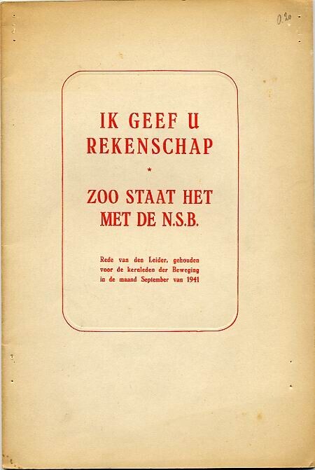 Nationaal-socialistische boek, met een uitgeschreven redevoering van Mussert gehouden voor de kernleden van de N.S.B. op 5 september 1941. Het boek heeft een witte kaft met rode opdruk en telt 28 pagina's.