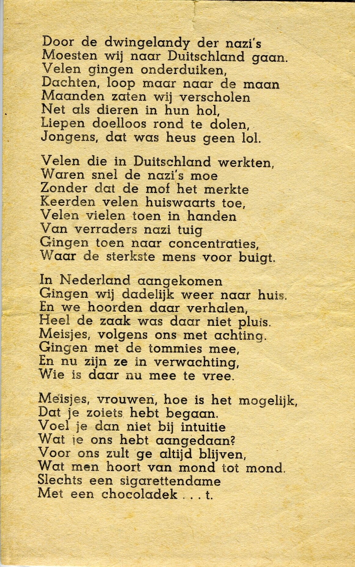 Gedicht - in druk - over mannen die bij terugkeer uit de gedwongen tewerkstelling in Duitsland erachter komen dat hun vrouwen en meisjes het met een soldaat van de geallieerden hebben gedaan: "Meisjes, volgens ons met achting, gingen met de tommies mee. En nu zijn ze in verwachting. Wie is daar nu mee tevree."