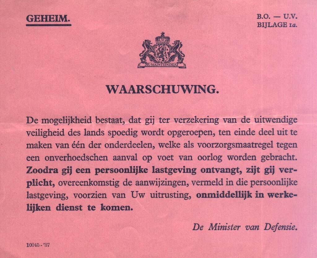Roze kaart waarmee de ontvanger gewaarschuwd wordt dat "de mogelijkheid bestaat, dat gij ter verzekering van de uitwendige veiligheid des lands spoedig wordt opgeroepen". De bijbehorende envelop is geadresseerd aan F.J. Seitzinger; erop zit een zegel: "Spoedbestelling".<br>Op de achterzijde van de envelop staat een stempel ''Korps luchtdoelartillerie''.<br>Er is een tweede set met een envelop waar alleen het adres ''Uddelstraat is vermeld.