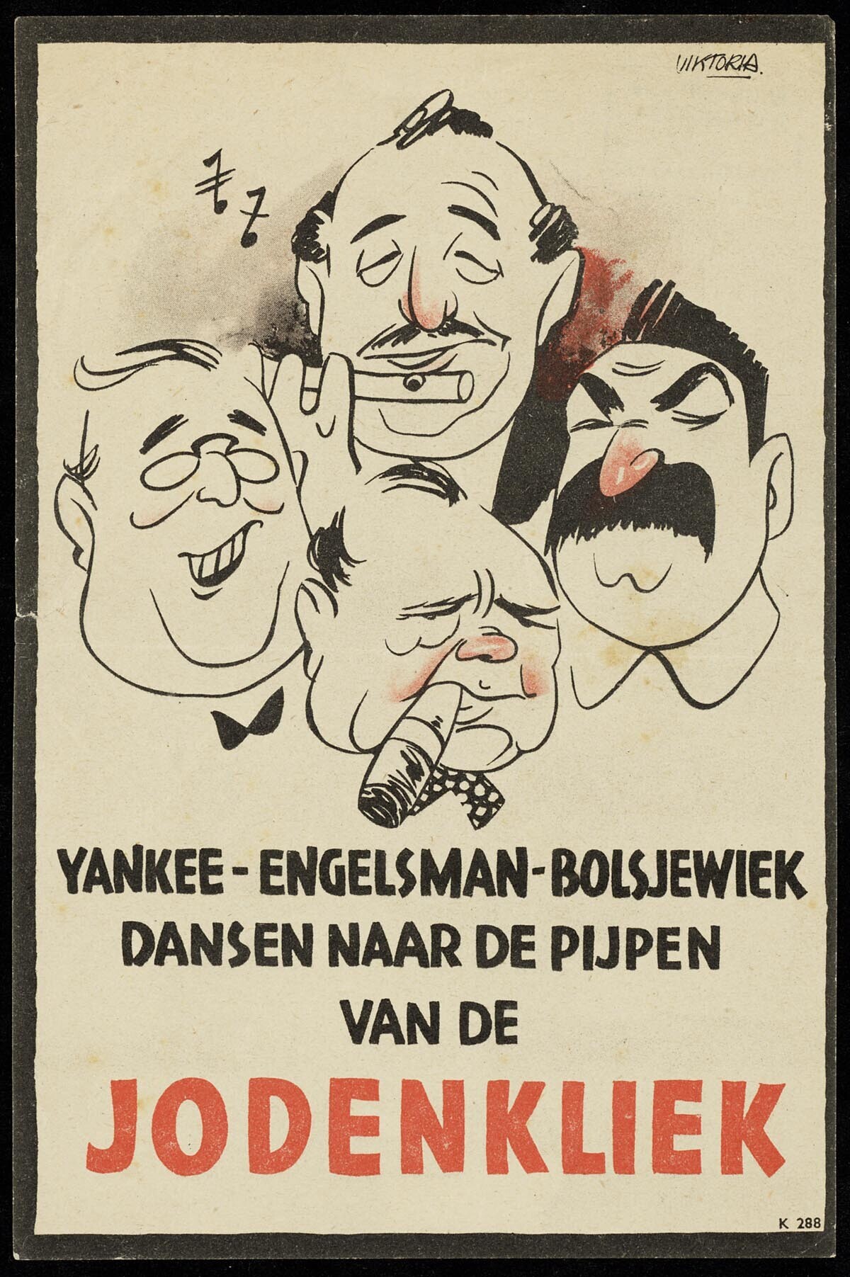 Zes exemplaren van een pamflet met de karikaturen van Stalin, Churchill, Roosevelt en een fluitspeler waaronder de tekst: "Yankee - Engelsman - Bolsjewiek dansen naar de pijpen van de Jodenkliek". Gesigneerd: "Viktoria". Er zijn twee grotere en vier kleinere (dubbelzijdig gedrukte) exemplaren.