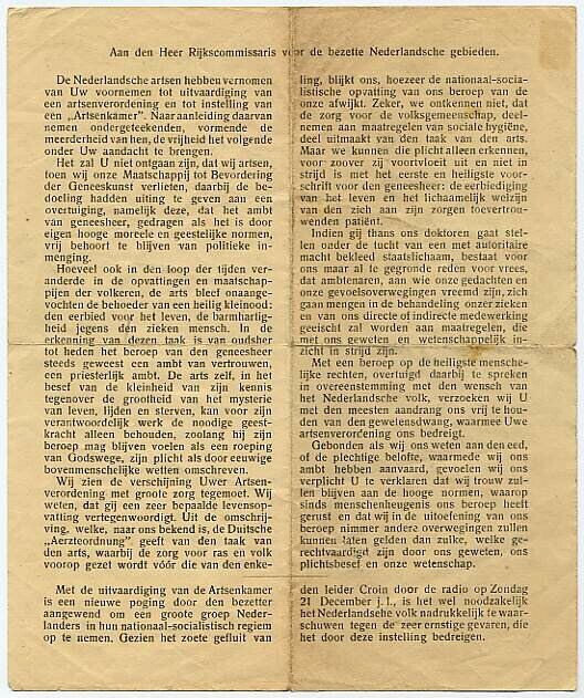 Gedrukt document met een protest van de Nederlandse artsen aan het adres van Seyss-Inquart in verband met de instelling van een "Artsenkamer".