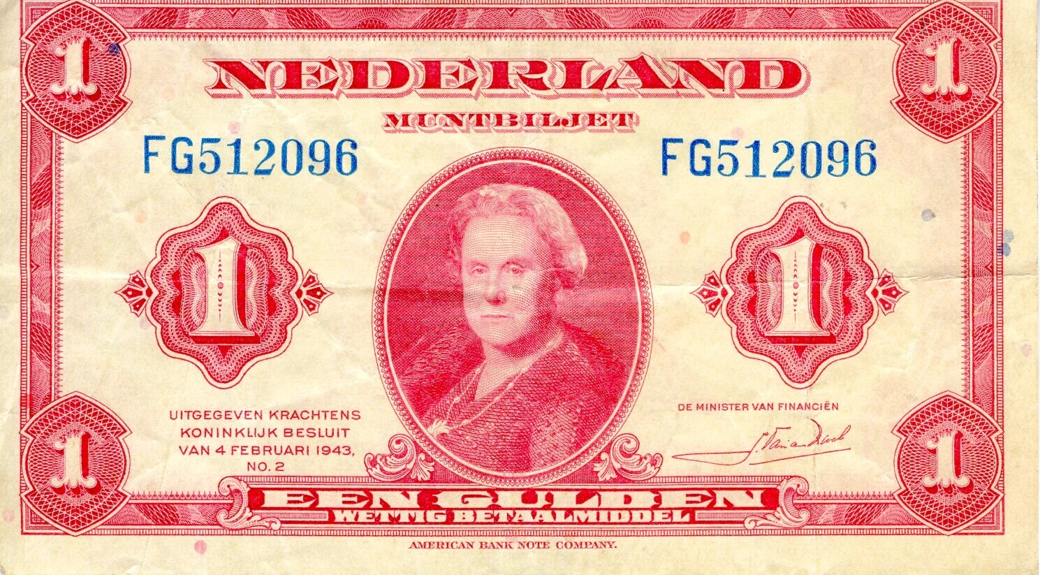 Drie bankbiljetten van 1 gulden met aan één kant rode opdruk en een portret van koningin Wilhelmina. Tekst: "Nederland. Muntbiljet. Uitgegeven krachtens Koninklijk besluit van 4 februari 1943. No. 2. Een gulden. Wettig betaalmiddel. American Banknote Company." Tevens de handtekening van de minister van Financiën. De serienummers zijn in blauw gedrukt: "FG512096; FN168810; FC403358". Op de andere kant oranje opdruk met het Nederlandse wapen en een wetstekst. Deze biljetten werden gebruikt om de Amerikaanse troepen, gelegerd in de zuidelijke provincies, te betalen. Na drie maanden werden ze door de Nederlandse regering weer ingetrokken. Om vervalsingen te voorkomen hebben ze gekleurde stippen in plaats van een watermerk.