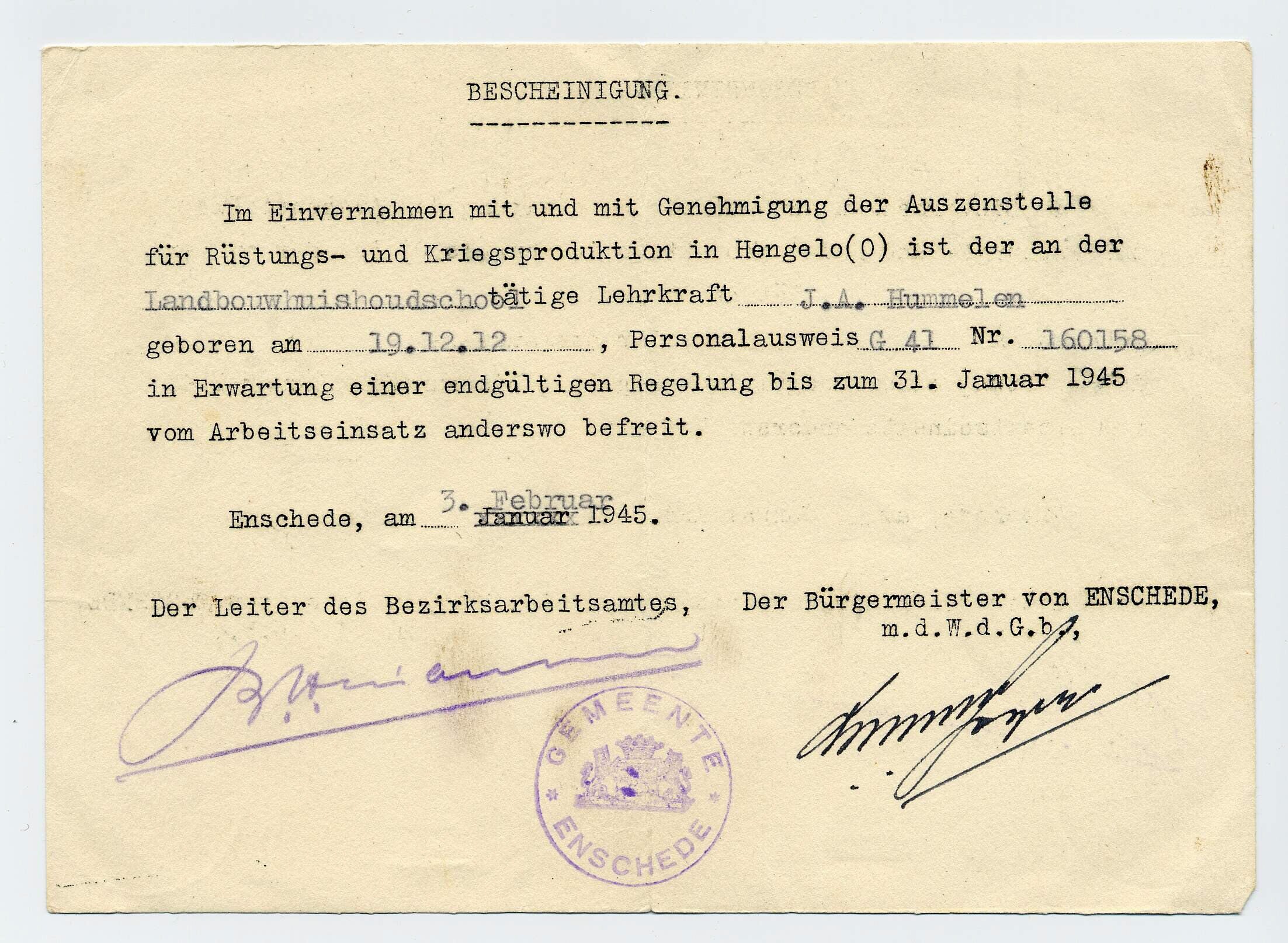Een in het Duits opgestelde verklaring uitgegeven door de gemeente Enschede, waaruit blijkt dat J.A. Hummele wegens zijn werk als leraar aan een landbouwschool in Enschede van de Arbeidsinzet is vrijgesteld.