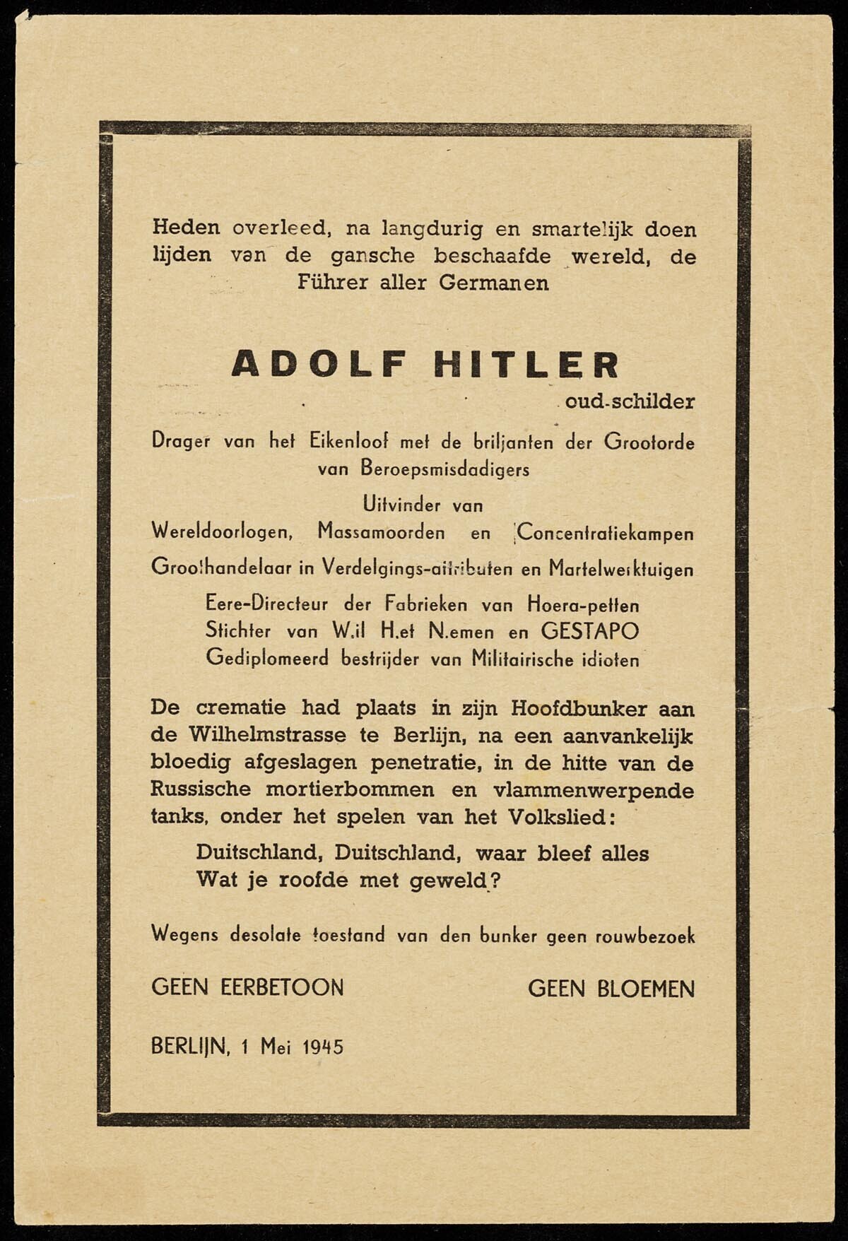 Satirisch bedoelde overlijdensadvertentie over Adolf Hitler gedateerd 1 mei 1945.
