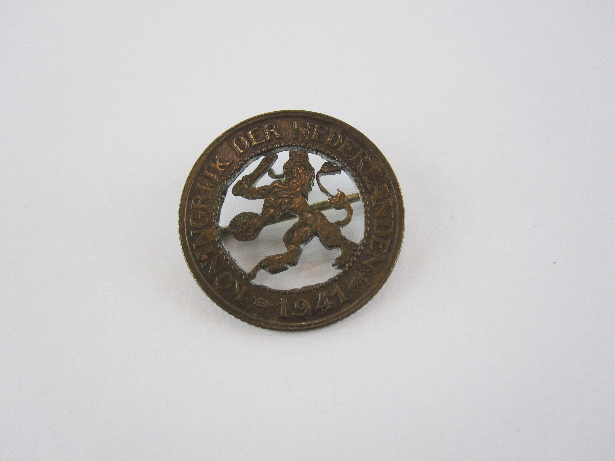 Een broche gemaakt van een munt van 1 cent waarbij de klimmende Nederlandse Leeuw is uitgesneden. Langs de rand: "Koninkrijk der Nederlanden 1941". Deze broche is een stil verzet tegen de Duitse bezetter.