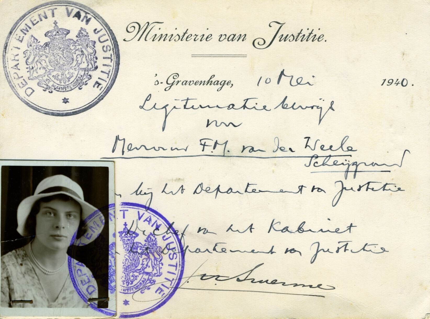 Een legitimatiebewijs van het Ministerie van Justitie op naam van mevrouw F.M. van der Weele-Scheijgrond werkzaam bij het Departement van Justitie. Het bewijs met pasfoto is gedateerd: 's-Gravenhage, 10 mei 1940.