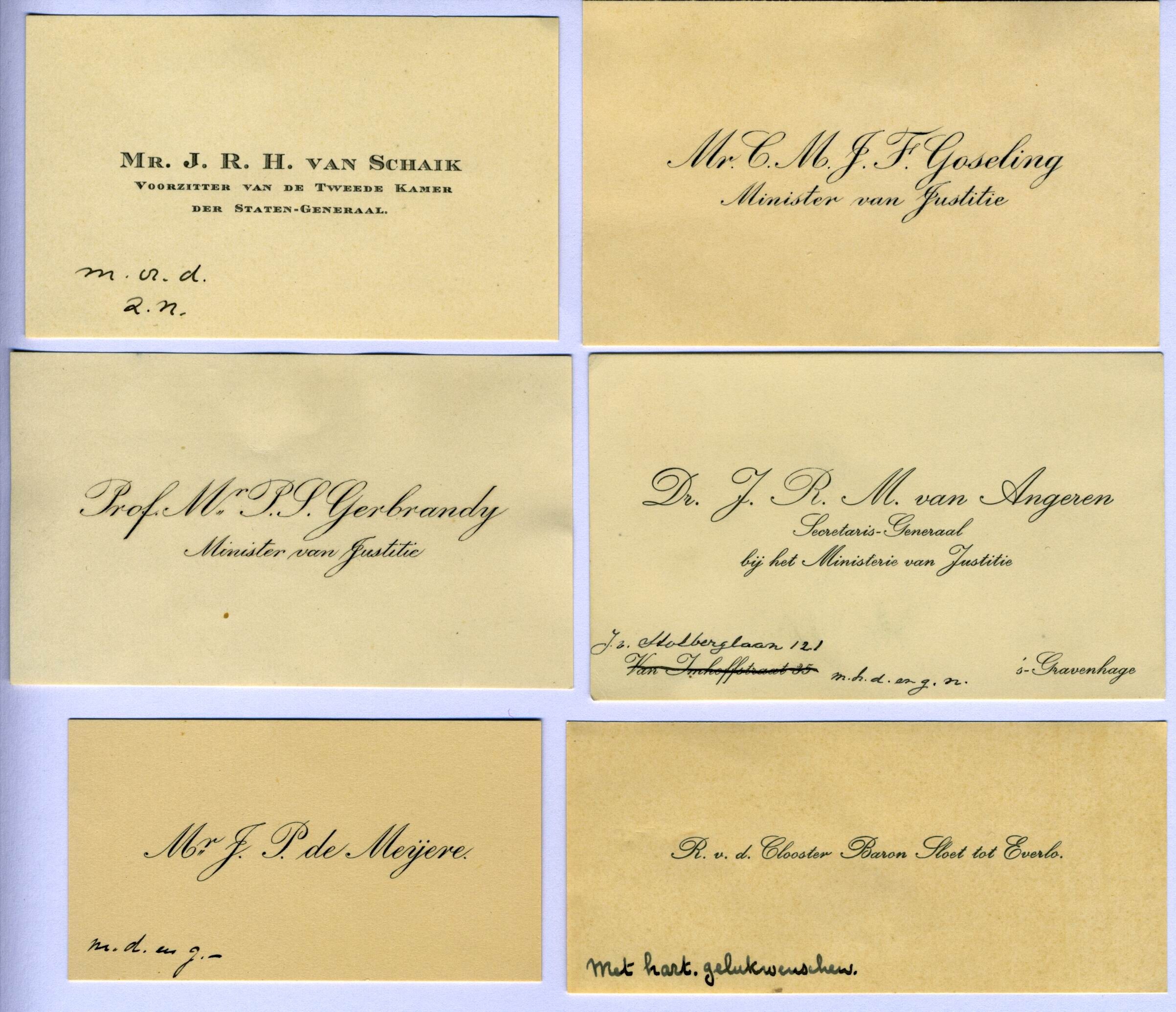 Zes visitekaartjes van regeringsvertegenwoordigers en prominenten die mevrouw F.M. van der Weele-Scheijgrond, werkzaam bij het Ministerie van Justitie, heeft ontvangen: "Mr. J.R.H. van Schaik, Voorzitter van de Tweede Kamer der Staten Generaal" en minister van Justitie, van 26 mei 1933 tot 24 juni 1937; "Mr. C.M.J.F. Goseling, Minister van Justitie" van 24 juni 1937 tot 25 juli 1939 ; "Prof. Mr. P.S. Gerbrandy, Minister van Justitie" van 10 augustus 1939 tot 21 februari 1942 en premier van de naar Londen uitgeweken Nederlandse regering; "Dr. J.R.M. van Angeren, Secretaris-Generaal bij het Ministerie van Justitie" van 12 juli 1944 tot 1 november 1945; "Mr. J.P. de Meijere" secretaris-generaal ministerie van Justitie, van 1 januari 1933 tot 1 december 1937; "R. v.d. Clooster Baron Stoet tot Everlo".