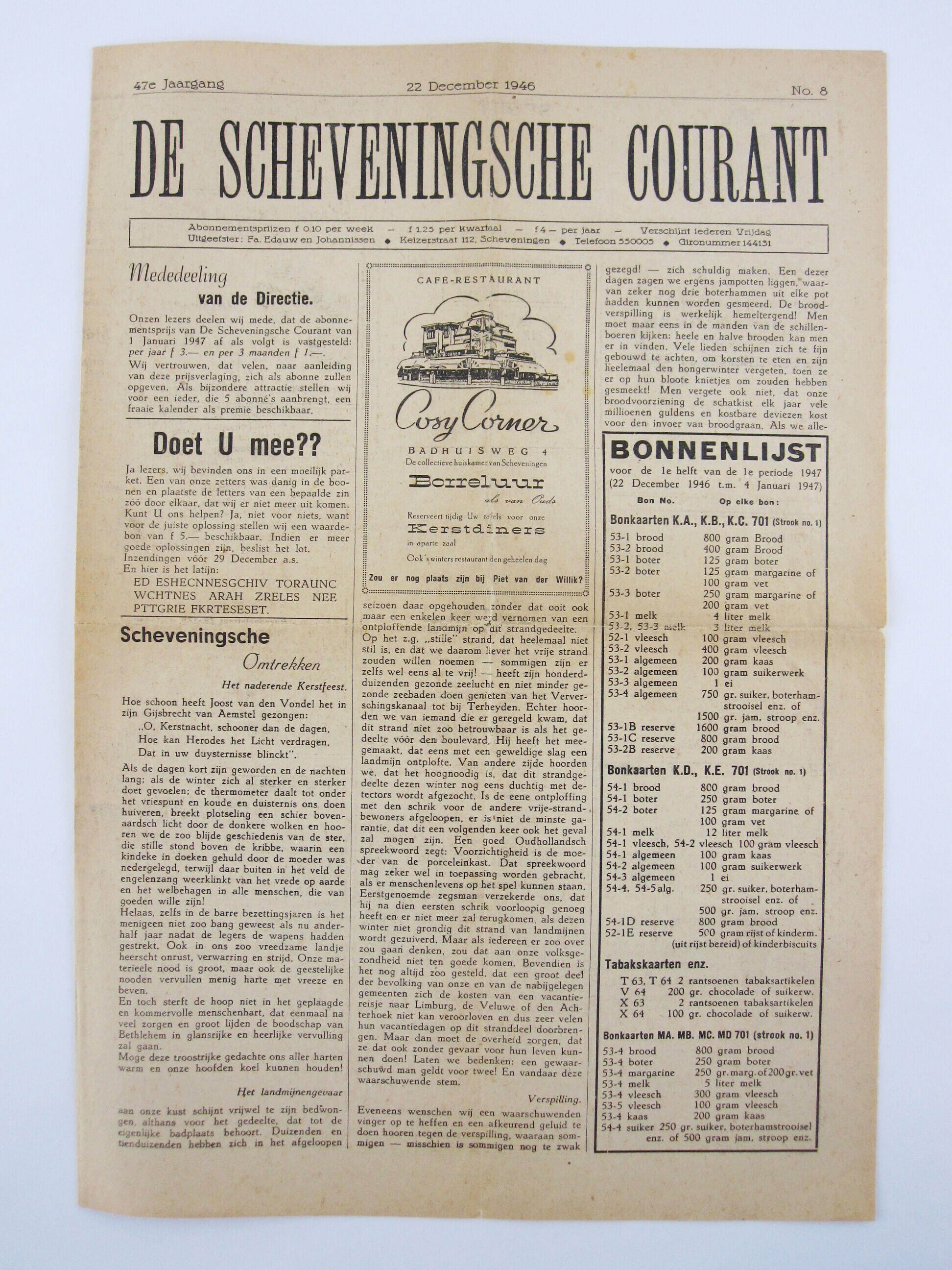 De "Scheveningsche Courant 47e Jaargang No. 8. 22 December 1946" met o.a. een bonnenlijst voor verschillende levensmiddelen en tegelijkertijd de mogelijkheid Kerstdiners te reserveren.