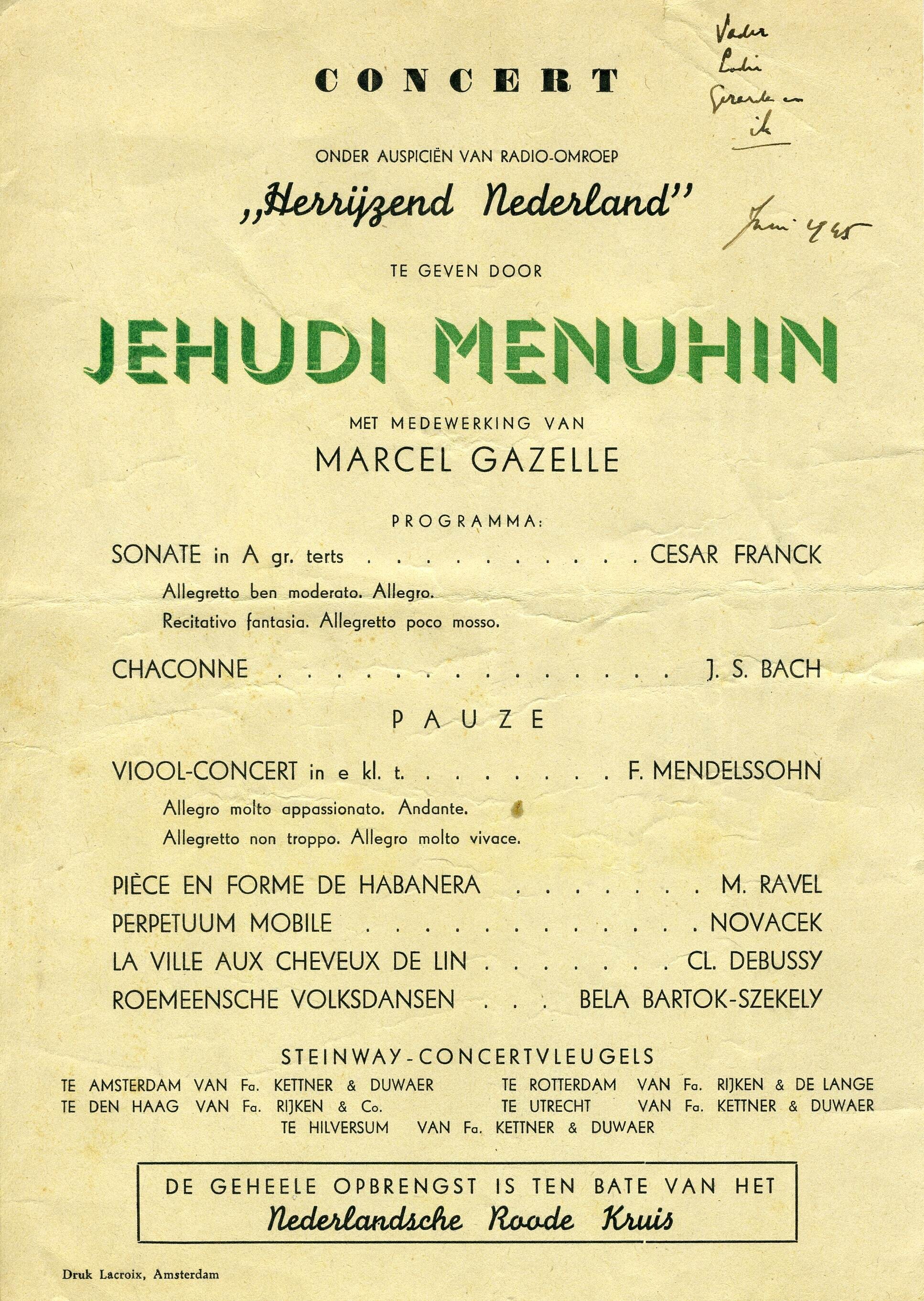 Een aankondiging voor een "Concert onder auspiciën van radio-omroep "Herrijzend Nederland" te geven door Jehudi Menuhin", waarvan de opbrengst ten goede komt van het Nederlandse Rode Kruis.