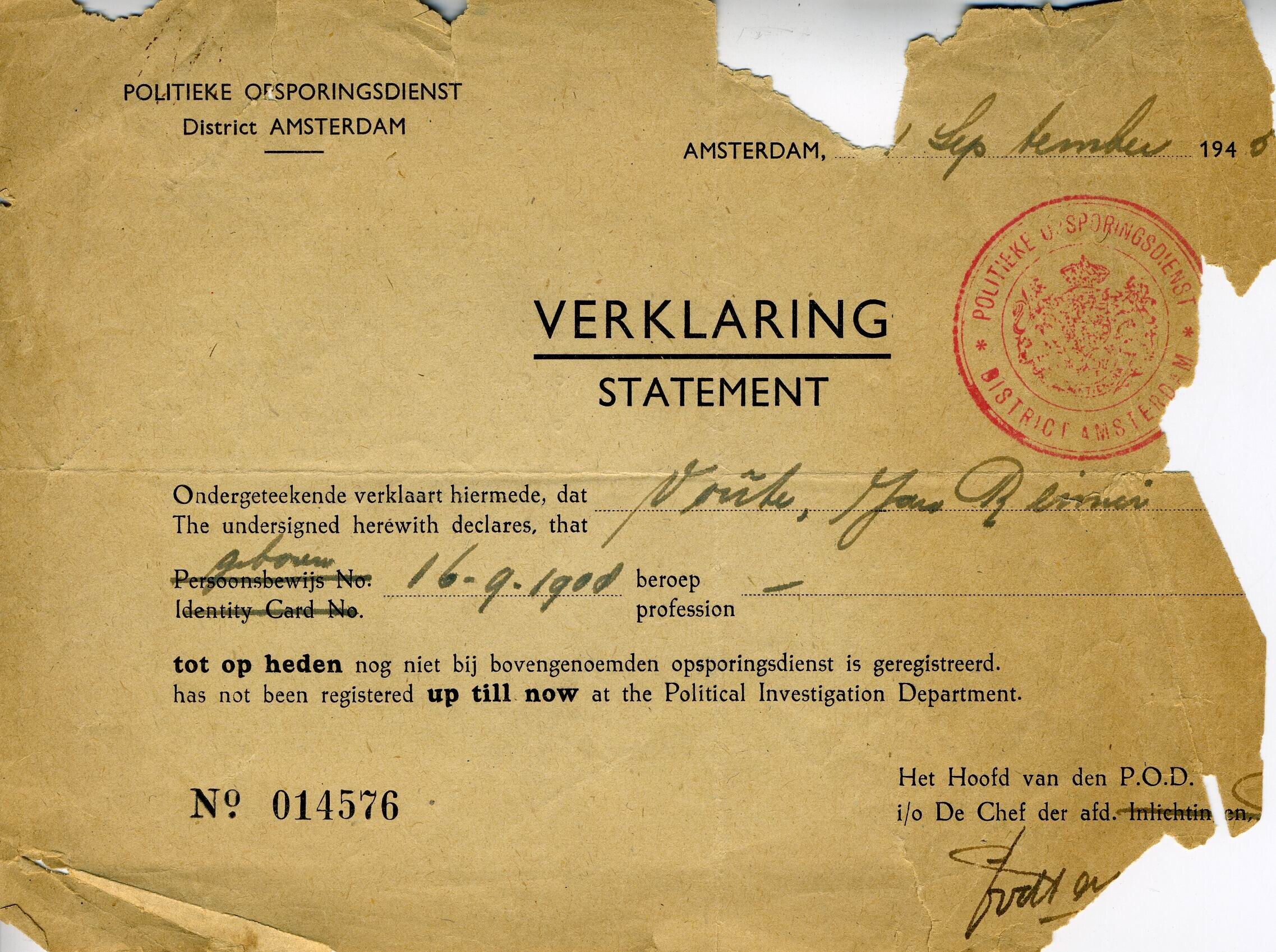 Een verklaring opgesteld in het Nederlands en Engels door de Politieke opsporingsdienst te Amsterdam op 1 september 1945, waarin wordt aangegeven dat Jan Reinier Voûte niet bij de dienst geregistreerd is.