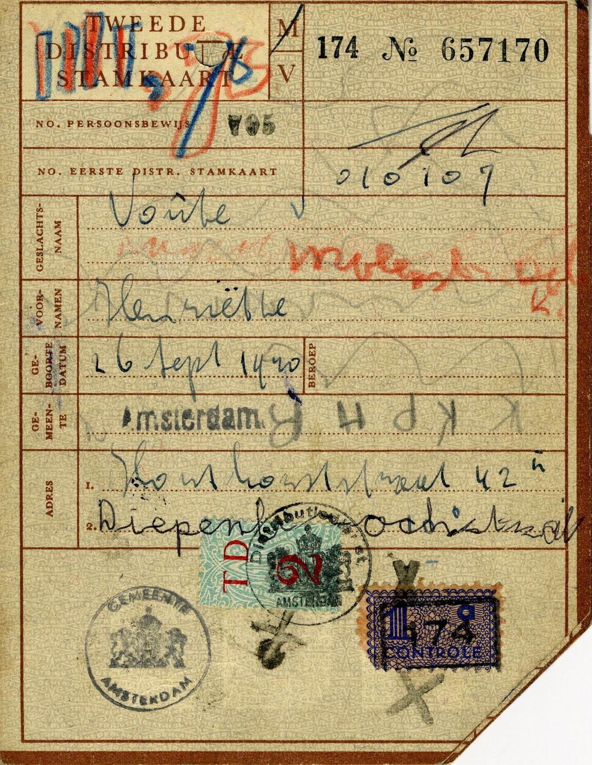 Vijf exemplaren van de "Tweede distributie stamkaart" op de namen van: Henriëtte Voûte, 26 september 1940; Jan Reinier Voûte, 16 september 1908; Justus Voûte, 19 januari 1948; Gerarda Johanna Theodora Voûte-Reijmers, 6 november 1905; Jan Lodewijk L. Voûte, 4 september 1943.