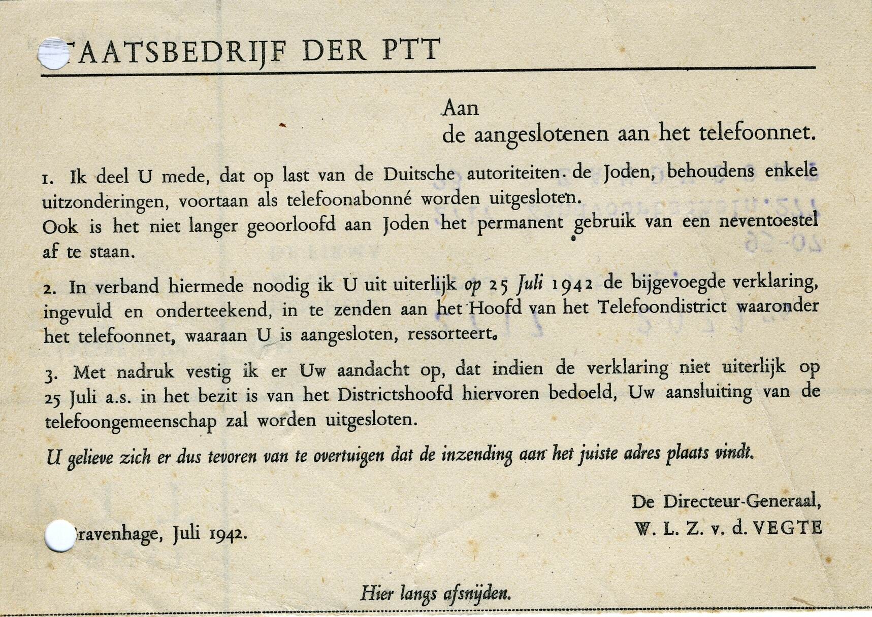 Een deel van een niet-Joodverklaring voor de PTT. Het gedeelte van de ingevulde verklaring is ervan afgeknipt. O.a. staat op het overgebleven deel: "Ik deel U mede, dat op last van de Duitsche autoriteiten, de Joden, behoudens enkele uitzoncderingen, voortaan als telefoonabonné worden uitgesloten".