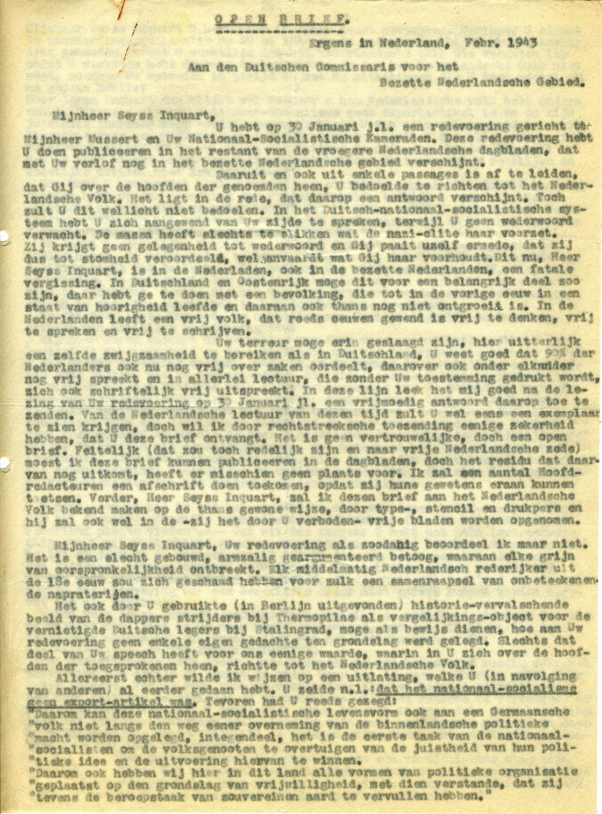 Een drie pagina's tellende doorslag van een getypte brief met als aanhef: "Open brief aan den Duitschen Commissaris voor het Bezette Nederlandsche Gebied", gedateerd: "Ergens in Nederland, Febr. 1943" en ondertekend door: "Een Nederlander" vol kritiek op de Duitse bezetter.
