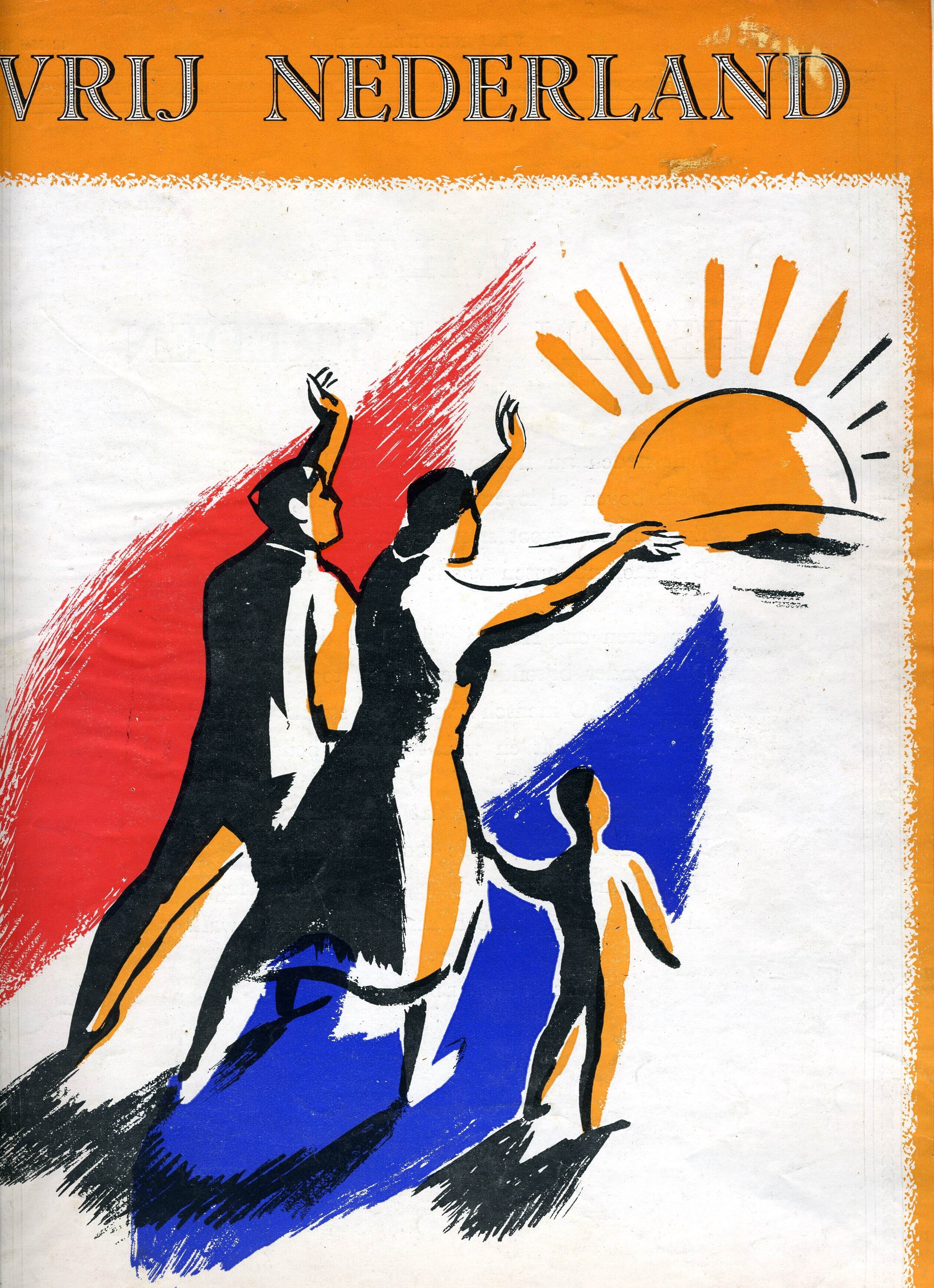 Een uitgave van de krant Vrij Nederland van 12 mei 1945 in een omslag met oranje, rood, wit en blauw ter gelegenheid van de bevrijding van Nederland.