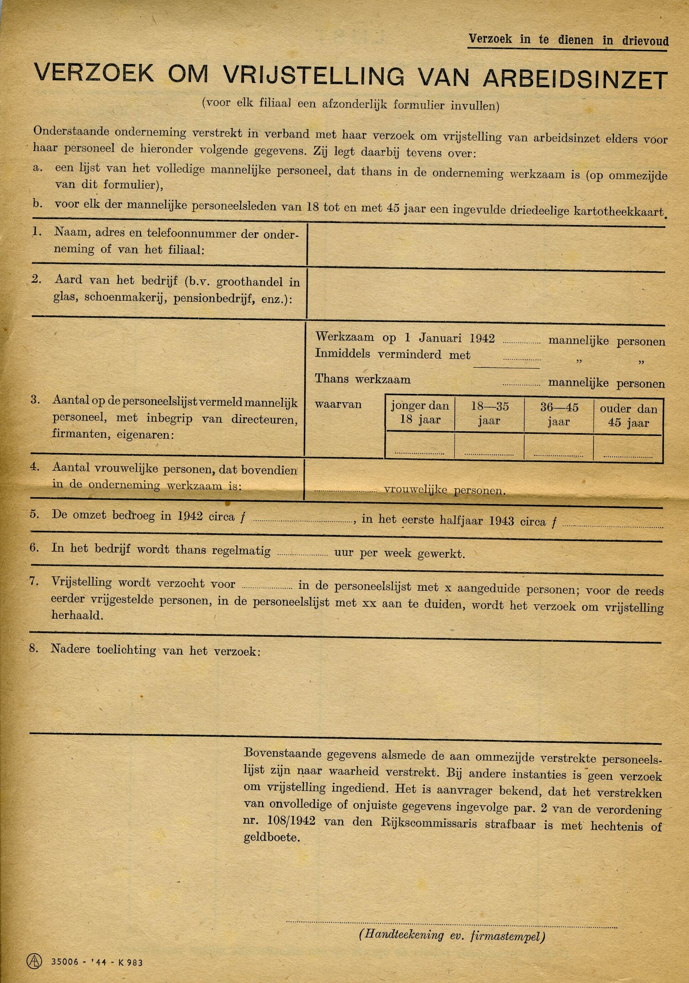 Een oningevuld formulier "Verzoek om vrijstelling van arbeidsinzet" ten behoeve van werkgevers die met dit formulier vrijstelling voor hun personeel konden aanvragen.