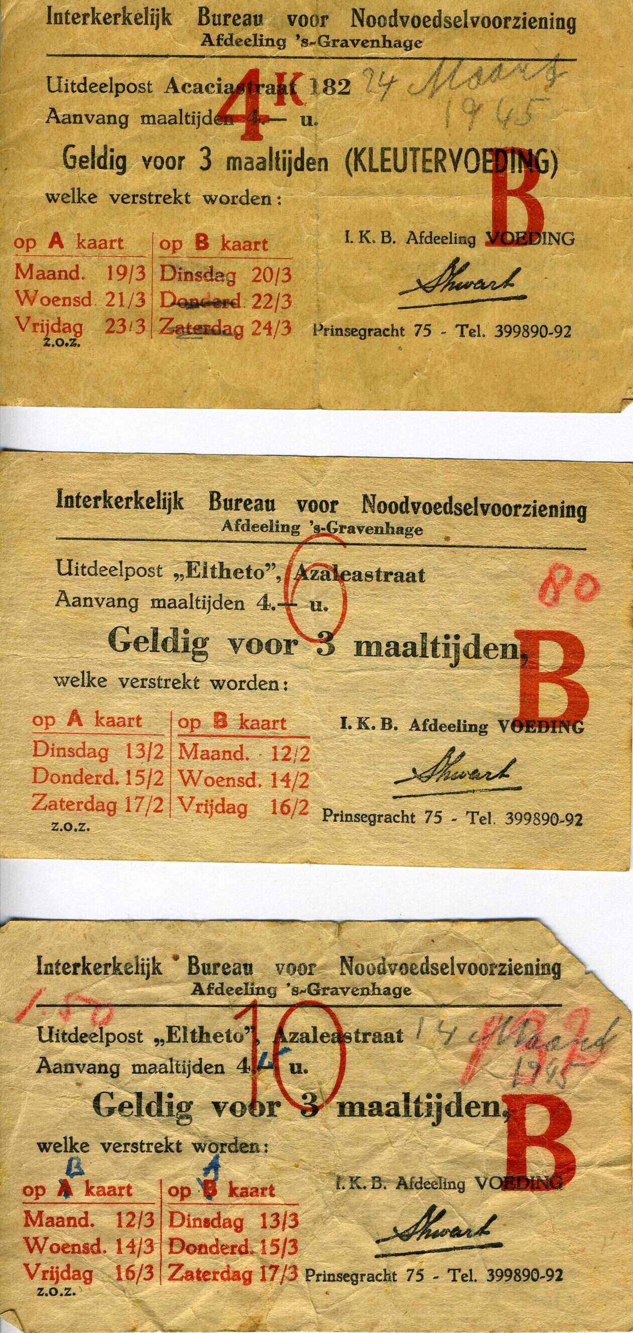 Drie maaltijdbonnen van het Interkerkelijk Bureau voor Noodvoedselhulp afdeling 's-Gravenhage Prinsegracht 75: 1 bon met in rode opdruk 4k is voor de uitdeelpost Acaciastraat 182 en geldig voor drie maaltijden kleutervoeding; 1 bon met in rode opdruk 6 is voor de uitdeelpost "Eltheto", Azaleastraat en geldig voor drie maaltijden; 1 bon met in rode opdruk 10 is voor de uitdeelpost "Eltheto", Azaleastraat en geldig voor drie maaltijden. Op de bon 4k is met potlood de datum 24 maart 1945 geschreven. Op de bon 10 staat 14 maart 1945. Op de bon 6 staat 15 februari 1945.